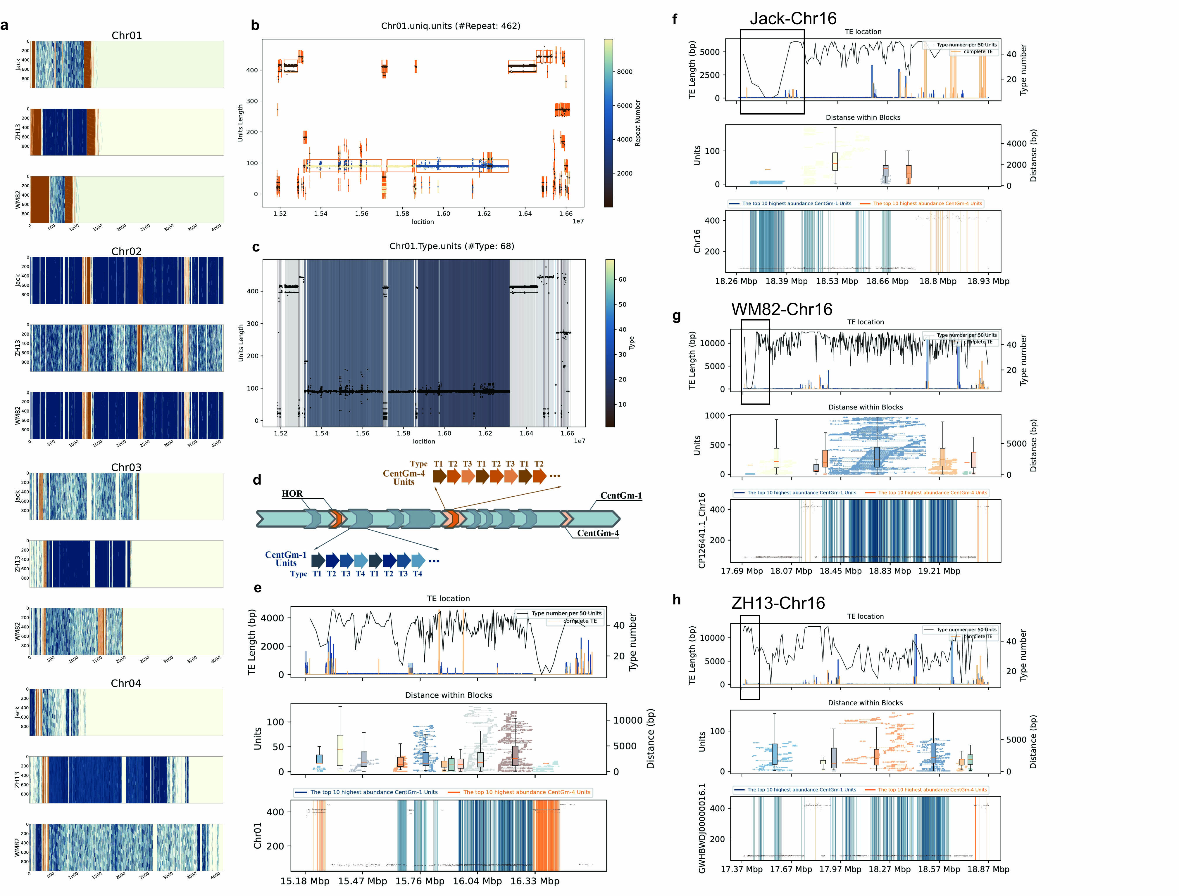 本研究发现,大豆着丝粒中的CentGm-1和CentGm-4并非随机分布,而是呈“簇状交替”的方式排列,同时着丝粒区域富含Gypsy类LTR反转录转座子(TE)。这些TE倾向插入在CentGm簇边界及变异高的区域,可能在连接或打断卫星重复阵列中发挥调控作用。研究进一步表明,高相似性且缺乏TE插入的CentGm簇,是导致不同大豆着丝粒卫星重复序列长度和组成差异的关键因素(图1)。