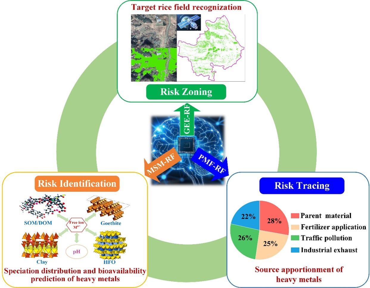 基于以上科学问题,研究团队将机器学习算法融入谷歌地球引擎(GEE)遥感解译、地球化学形态模拟与污染指纹溯源技术,耦合目标田块识别、重金属形态预测、污染来源解析等关键环节,构建了区域尺度稻田重金属风险评估框架。机器学习算法的引入,大幅提升了风险识别、区划与溯源的准确度。