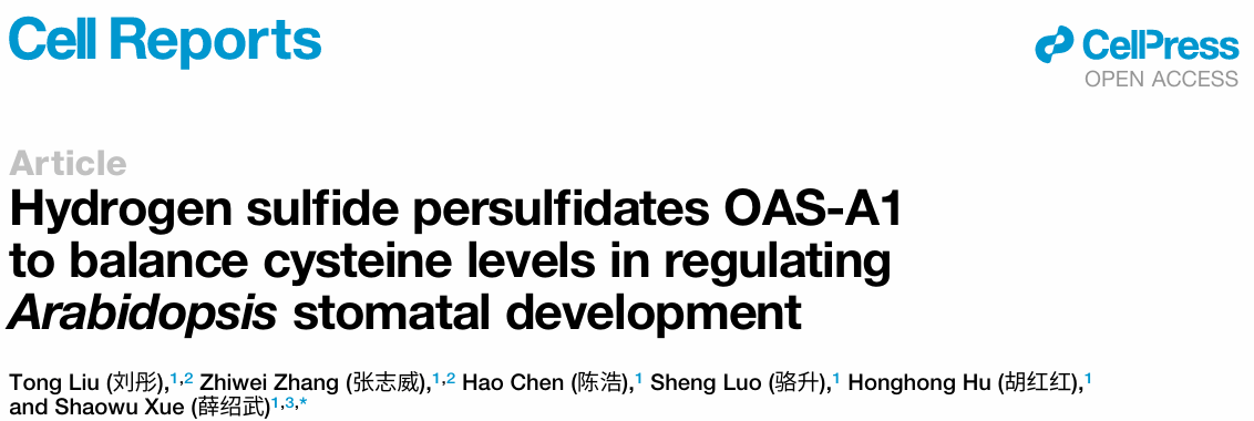 近日,华中农业大学生命科学技术学院、湖北洪山实验室薛绍武课题组在国际权威期刊Cell Reports在线发表了题为“Hydrogen sulfide persulfidates OAS-A1 to balance cysteine levels in regulating Arabidopsis stomatal development”的研究论文,揭示了H2S介导OAS-A1的巯基化,催化合成足够的Cys维持GSH-H2O2稳态并稳定气孔发育。