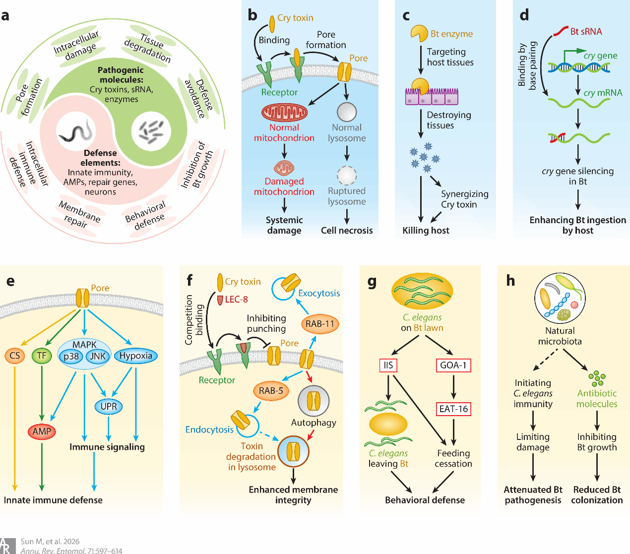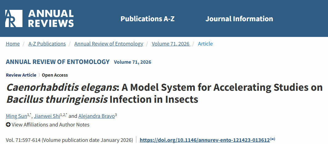 南湖新闻网讯(通讯员 石建伟)1月29日,华中农业大学农业微生物资源发掘与利用全国重点实验室微生物农药创新团队负责人孙明教授受邀在昆虫学领域国际学术期刊Annual Review of Entomology发表了题为“Caenorhabditis elegans: A Model System for Accelerating Studies on Bacillus thuringiensis Infection in Insects”的综述文章,提出了“加速苏云金芽胞杆菌侵染昆虫和线虫的生物学研究模型系统”的学术观点和建议。