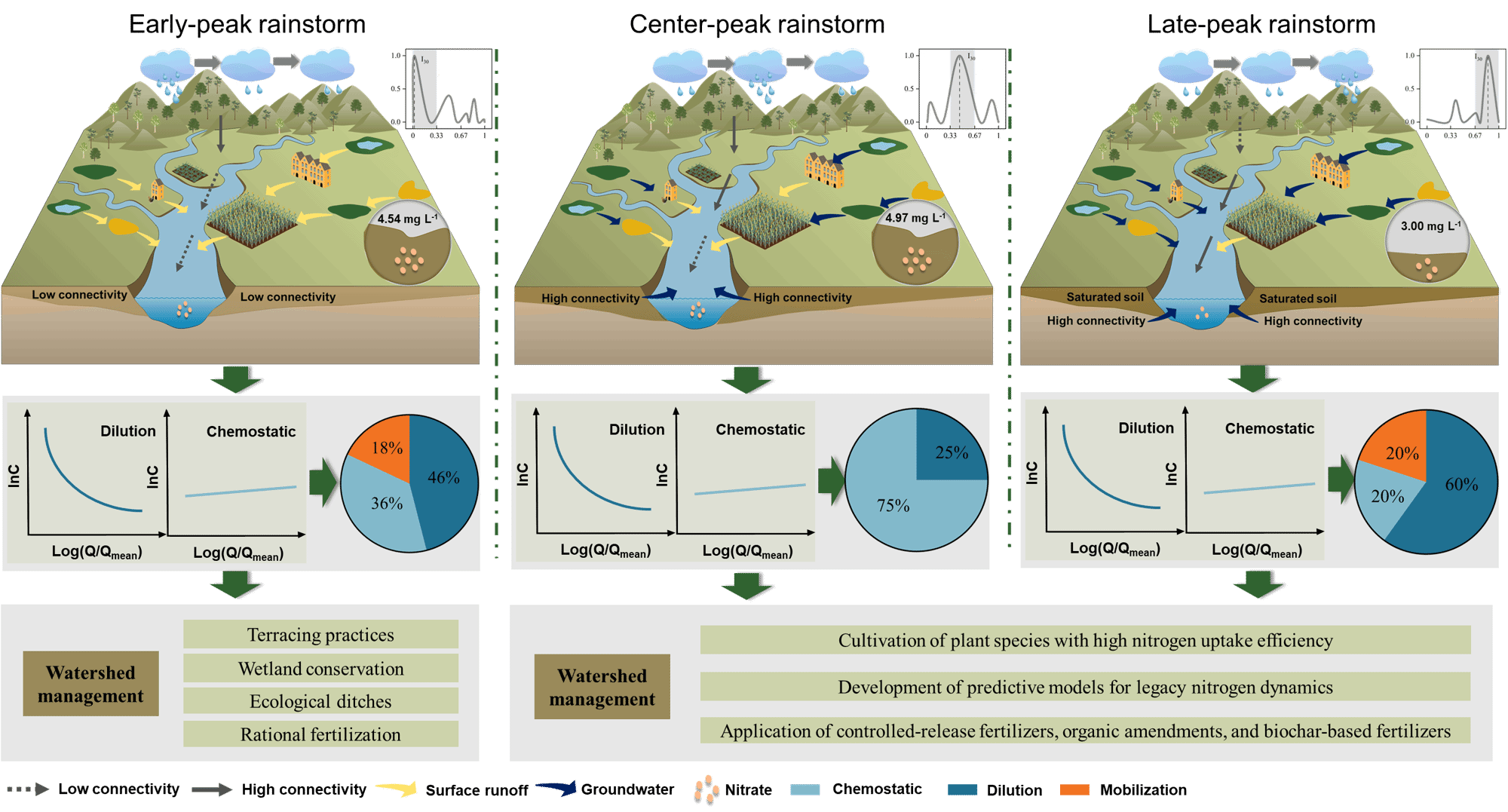 该研究不仅深化了对暴雨—径流—水质耦合过程的理解,更有助于流域差异化治理策略的制定。例如,在早峰型暴雨事件多发区域,应强化生态沟渠、湿地拦截等面向地表径流的治理工程;而在晚峰型暴雨主导区,则需关注深层含水层中遗留氮的释放风险。