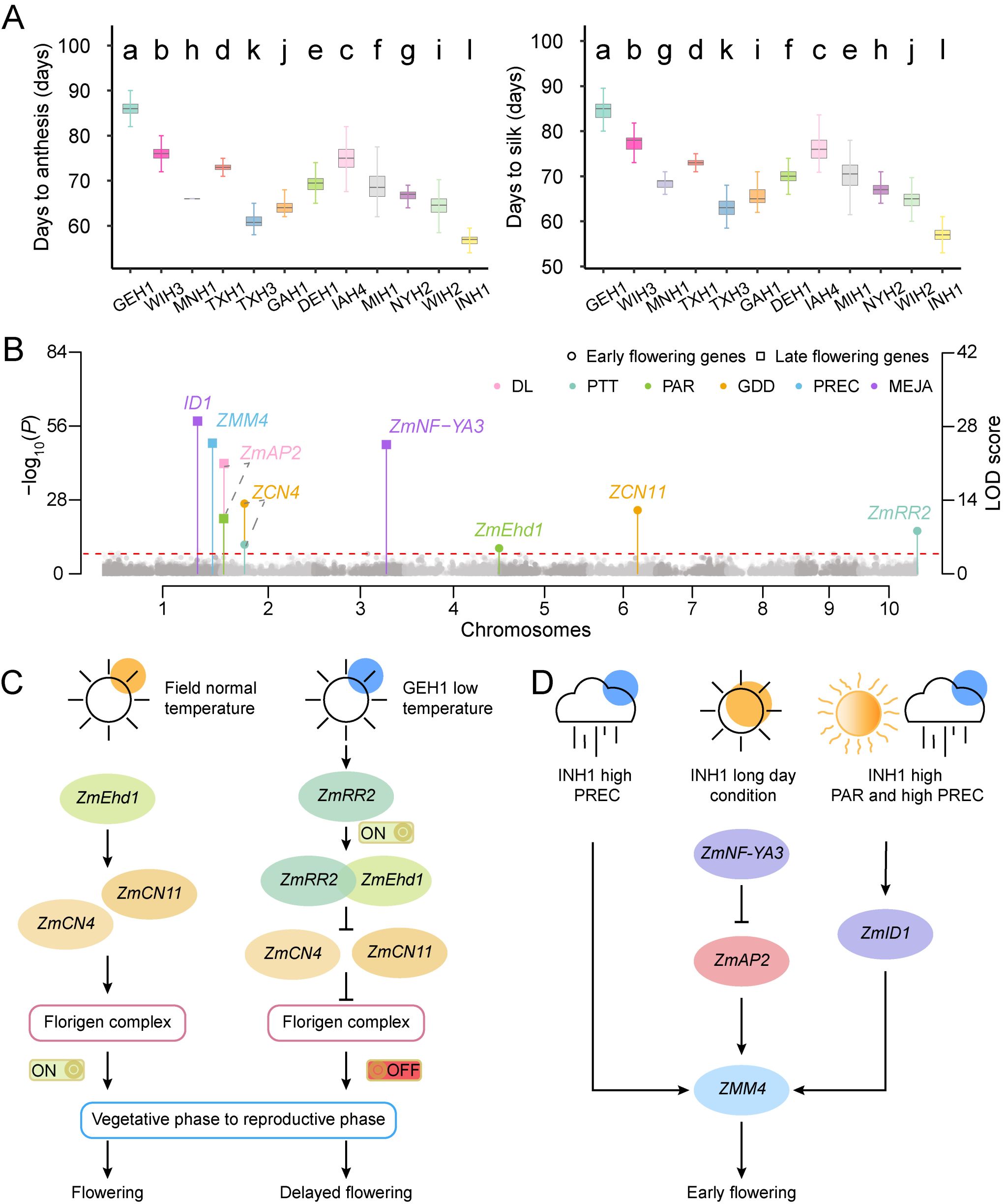 作物在不同环境中表现出显著的表型可塑性,其本质是基因对环境和气象因素的响应。围绕玉米开花期这一重要性状(图3A),本研究整合了来自12个环境的1,140份玉米自交系开花表型、437,214个SNP标记基因型和相应时空的气象数据,利用Fast3VmrMLM和Fast3VmrMLM-Hap方法,从多环境性状表型“直接”、性状对气象因素的回归参数“间接”两个层面系统挖掘GEIs(图3B),揭示不同地区玉米开花早晚差异的遗传×环境互作的遗传基础。