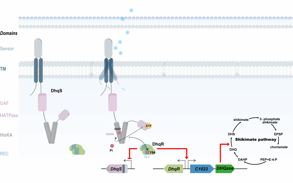 DhqSR双组分系统调控的下游基因是什么?通过DNA免疫沉淀测序,研究团队发现DhqR可以结合三个启动子区域:自身启动子、dhqS启动子,以及一个编号为HB27c_C1022基因的启动子。HB27c_C1022与下游的HB27c_C1023基因共转录。HB27c_C1023编码的蛋白是II型3-脱氢奎尼酸脱水酶,这是莽草酸途径的关键酶。莽草酸途径是合成芳香族氨基酸(苯丙氨酸、酪氨酸和色氨酸)的必经之路。在低温条件下,酶促反应速率会下降。嗜热菌通过上调莽草酸途径关键酶的表达,增加芳香族氨基酸的供应,从而保证蛋白质合成不受影响。这是一种非常聪明的适应策略(图1)。