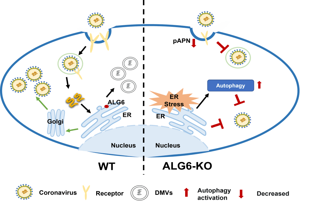 研究发现,宿主因子ALG6能够调控多种冠状病毒的复制。ALG6缺失可从多个层面抑制病毒复制,证实其催化活性直接决定着病毒的复制效率。敲除ALG6后,病毒入侵所依赖的受体——氨基肽酶N(ANPEP)的表达水平显著下调,从而在病毒进入环节即建立第一道防线。进一步机制研究表明,ALG6缺失会触发宿主细胞内质网应激反应,为病毒复制营造不利的细胞环境。更为关键的是,ALG6缺失主要通过激活内质网应激引发的下游自噬通路,有效阻断病毒复制。透射电子显微镜成像分析显示,敲除ALG6能破坏冠状病毒复制所必需的双层囊泡(DMVs)的形成。DMVs作为病毒在宿主细胞内搭建的“复制工厂”,其形成受阻意味着病毒失去了基因组复制的重要场所。