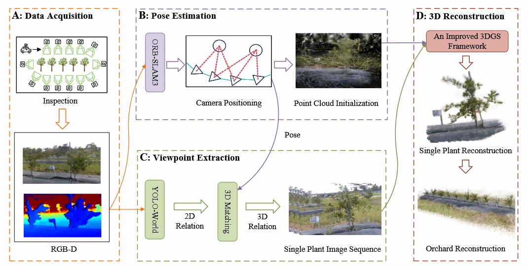 图1:果园重建框架。A.基于巡检机器人和RGB-D图像的数据采集。B.基于SLAM的姿态估计。C.利用2D和3D匹配提取单株植物视点。D.利用3DGS对单株植物重建进行细化,生成最终的大比例尺果园图