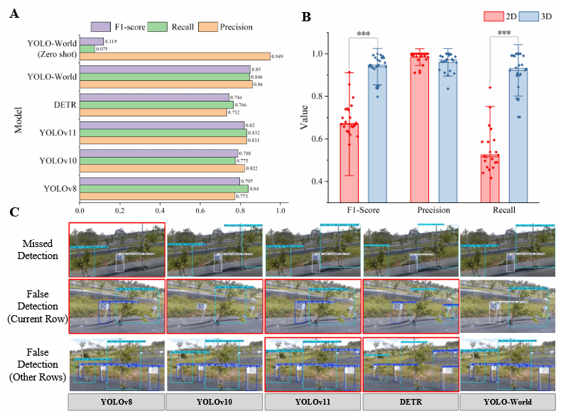 图2:单株植物影像提取实验结果。A.目标检测模型的三重交叉验证的平均性能。B. 2D和3D匹配方法的性能比较。C.目标检测模型的可视化结果。红色突出显示的区域表示检测错误