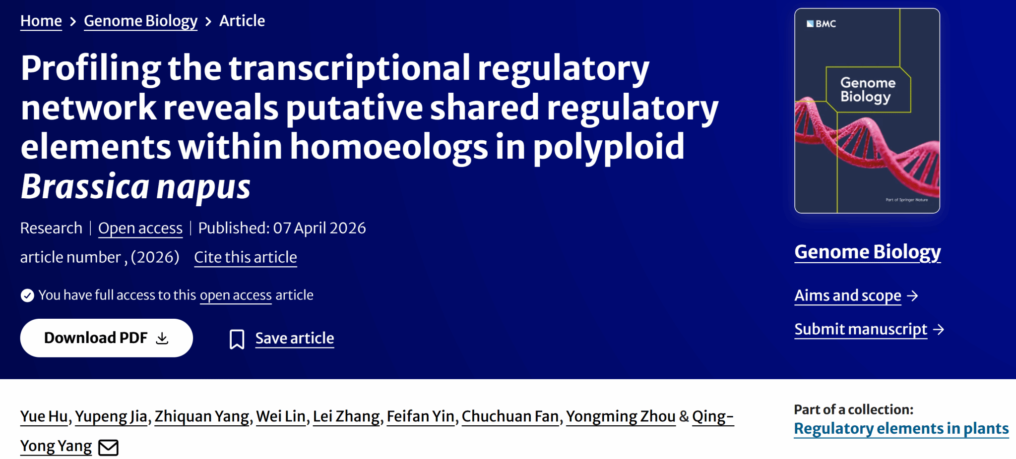 2026年4月7日,我校杨庆勇教授课题组在国际期刊Genome Biology 发表题为“Profiling the transcriptional regulatory network reveals putative shared regulatory elements within homoeologs in polyploid Brassica napus”的研究论文。该研究以四倍体油菜为研究对象,通过整合多组学数据构建全基因组转录调控网络,在此基础上提出并系统验证了“同源基因共享调控元件”的新机制,从网络结构与空间组织两个层面,为理解多倍体基因表达协同提供了关键证据。