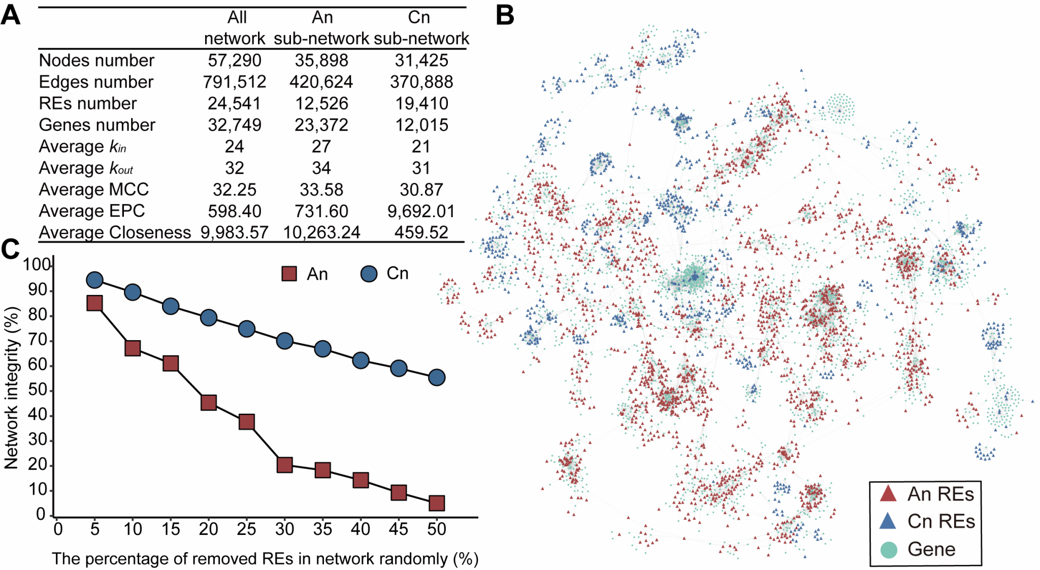 除了共享调控机制外,研究还系统分析了调控网络在两个亚基因组之间的结构差异。结果显示,An亚基因组在网络中的节点数量、连接关系以及多种拓扑指标(如最大团中心性、边缘渗透分量和接近中心性)均高于Cn亚基因组,提示其在整体调控网络中处于更加核心的位置(图2A-B)。通过随机删除节点的模拟实验发现,在相同扰动条件下,Cn亚基因组网络完整度由94.50%下降至51.75%,而An亚基因组则由85.27%下降至2.61%,表明An亚基因组在维持网络整体结构中更接近“骨架”角色(图2C)。进一步分析指出,这种主导性主要来源于其独特的网络拓扑结构,而非单纯由节点数量差异所致。