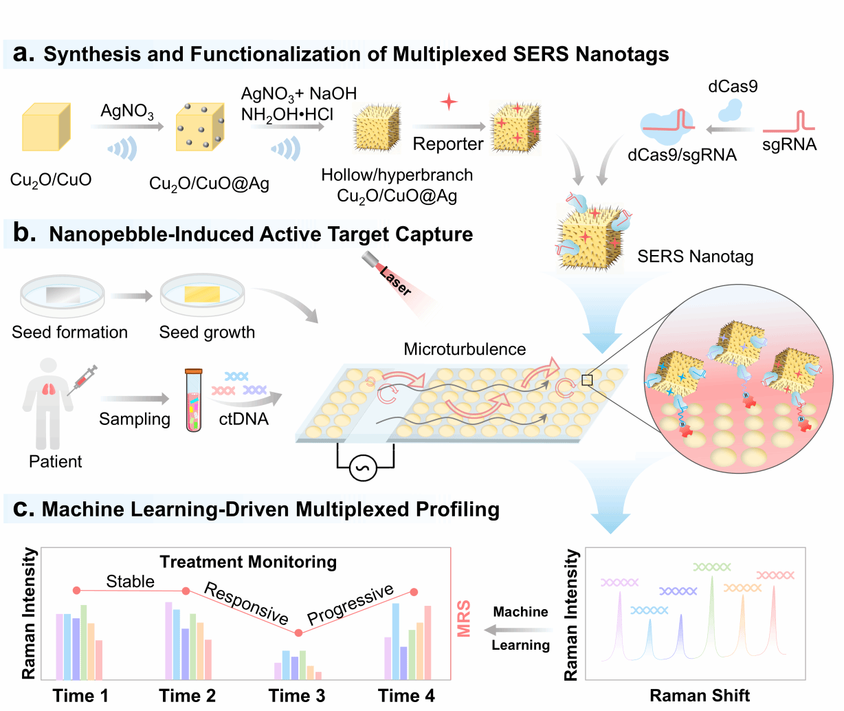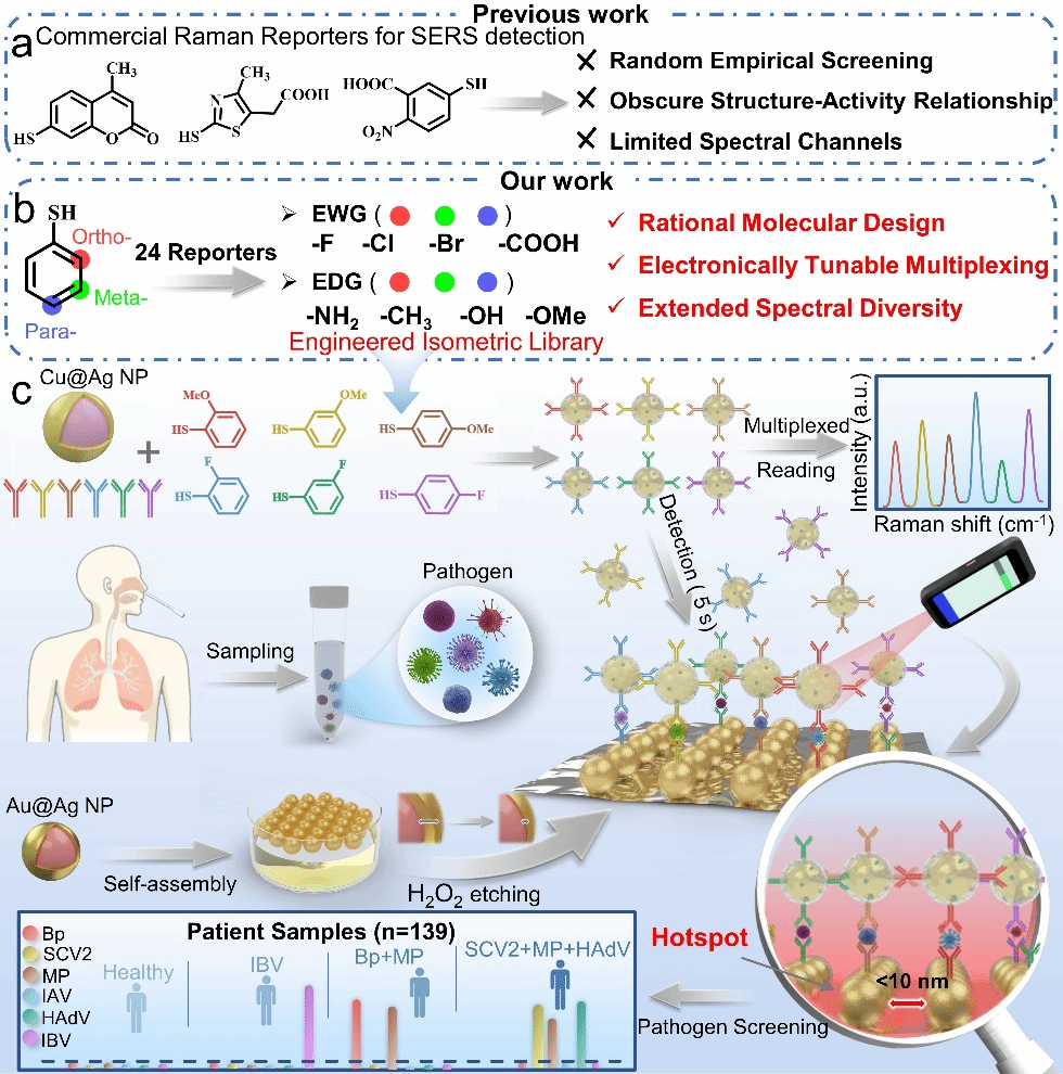 表面增强拉曼散射(SERS)凭借实时、无损及操作简便等优势,在分子诊断领域已展现出重要的应用潜力。然而,随着国家对重大与新发疾病的临床即时快检技术(POCT)提出了更高要求,分子光谱测量技术的时效性与精准性也面临新的挑战。一方面,当前SERS检测主要依赖固-液界面上的被动传质过程,时效性明显不足,无法满足POCT的需求;另一方面,现有SERS检测的通道数扩展主要依赖商用拉曼报告分子的随机筛选,不仅耗时耗力,且易产生光谱重叠,导致检测通道容量严重受限。