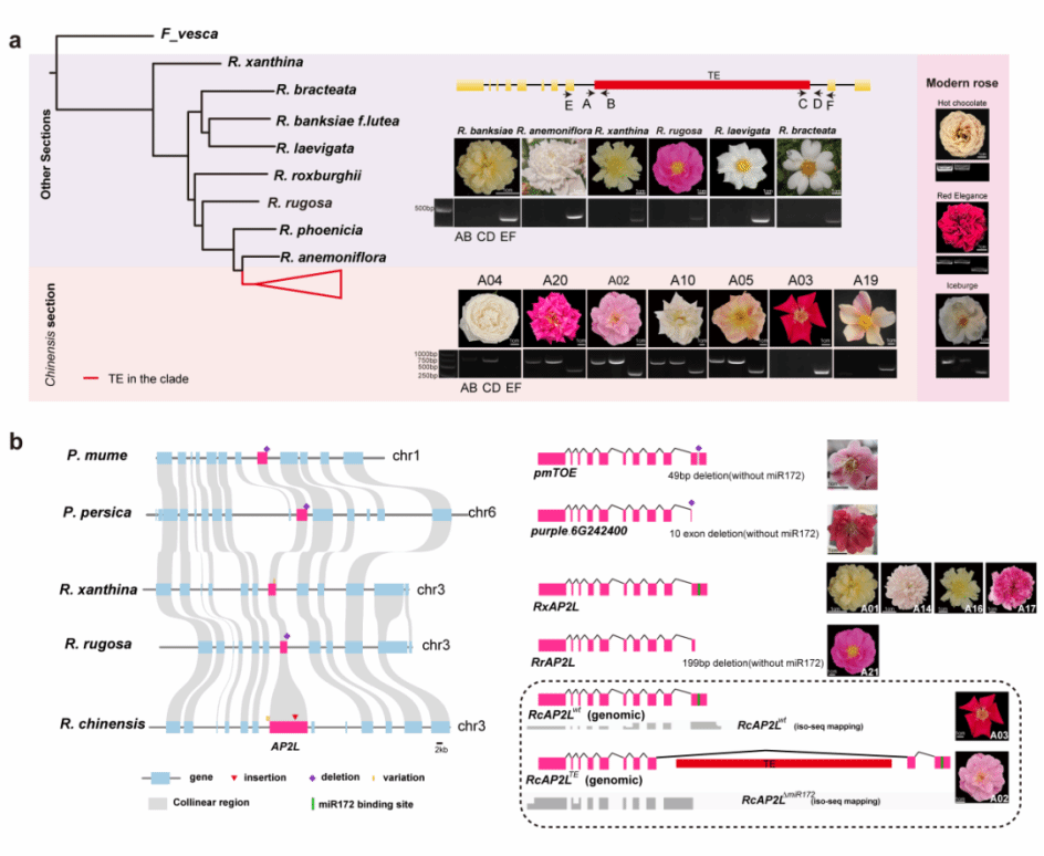 基于构建的高质量蔷薇亚属泛变异图谱,整合结构变异与转录组数据,本研究系统解析了月季重要观赏性状的遗传调控机制。在连续开花性状中,发现Chinenses组种质在3号染色体上存在特有倒位,且该倒位与调控持续开花的RcKSN基因缺失高度连锁;群体关联分析进一步鉴定出4个与连续开花显著相关的关键SNP位点。该特有倒位与关键 SNP 位点的联合鉴定,为阐释 Chinenses 组连续开花性状的演化与遗传调控提供了新依据。在重瓣性状中,转座子插入介导的AP2L表达调控机制特异存在于Chinenses组,而其他蔷薇亚属种质中还存在不同调控方式,如AP2L提前终止导致miR172结合位点缺失及启动子SNP变异影响基因表达等。此外,在花瓣变色性状中,功能关联分析表明CCD4基因在中国古老月季“蝴蝶”中呈现特异表达延迟,导致β-胡萝卜素降解滞后,从而促使花瓣出现短期橙色,随后由橙向红转变;其启动子中光响应元件等差异可能调控该表达模式。综上,本研究从分子层面阐明了月季关键观赏性状的遗传机制,为花色、花型及花期的分子设计育种提供了重要靶标与基因资源。