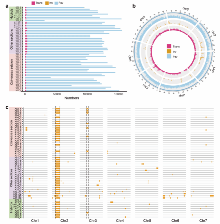 基于55个高质量泛单倍型基因组,本研究首次在单倍型分辨率下系统构建了蔷薇亚属种质间的泛变异精细图谱,共获得1,738,269个非冗余存在/缺失变异(PAVs)、1,567个倒位和61,701个易位。在此基础上,构建了蔷薇亚属倒位变异图谱,并进一步揭示倒位变异可介导功能基因缺失,从而影响相关性状。进一步分析发现,约70%的变异与转座元件(TEs)相关,表明TEs在结构变异的形成与扩增过程中发挥重要作用。