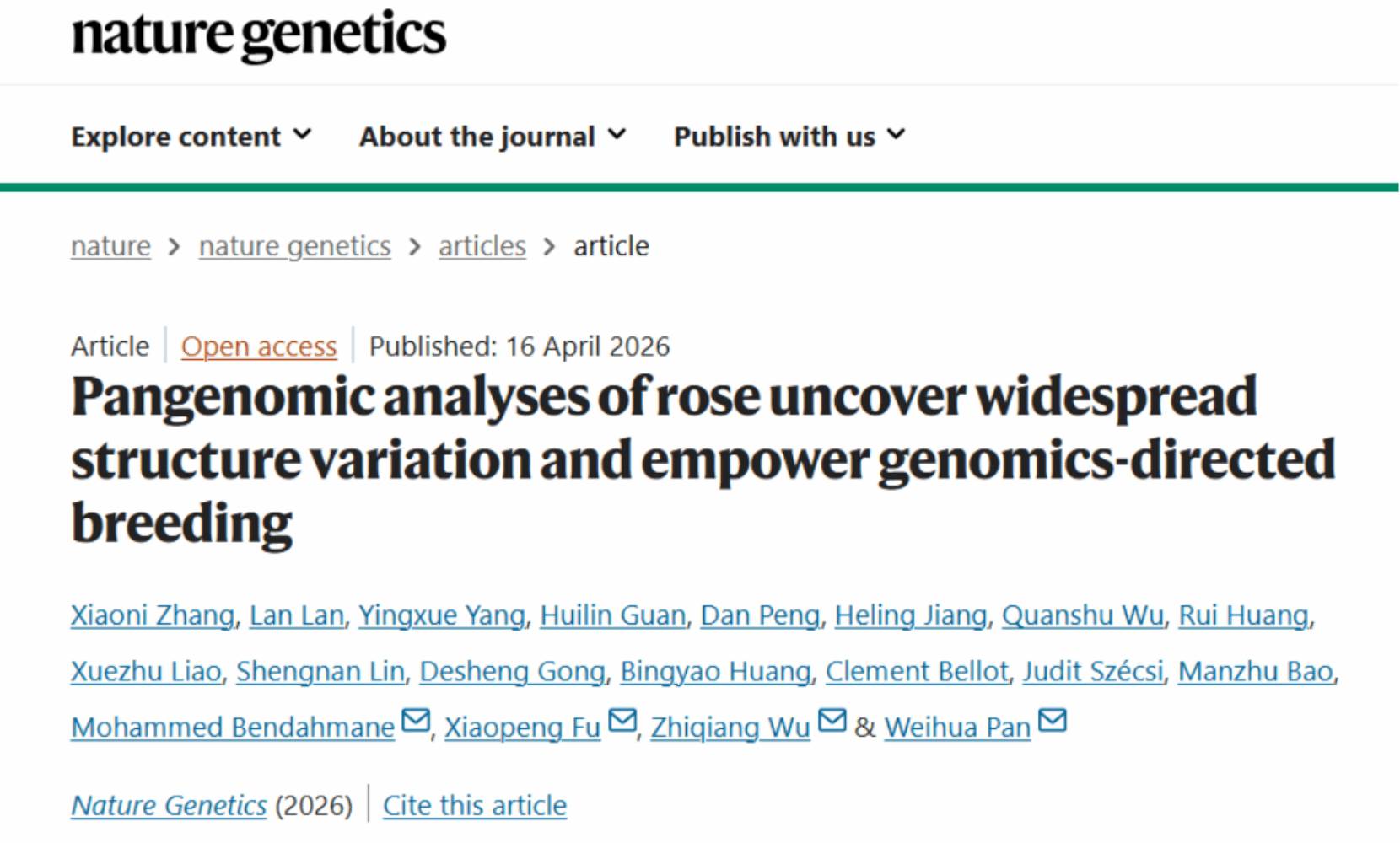 北京时间2026年4月16日,华中农业大学果蔬园艺作物种质创新与利用全国重点实验室/园艺林学学院傅小鹏课题组联合中国农业科学院农业基因组研究所(基因组所)、佛山鲲鹏现代农业研究院,青岛农业大学等在国际顶尖期刊《Nature Genetics》上在线发表了题为“Pangenomic analyses of rose uncover widespread structure variation and empower genomics-directed breeding”的研究论文。该研究构建了高质量单倍型解析蔷薇亚属泛基因组图谱,系统解析蔷薇亚属种质资源。该成果有望推动月季育种从传统经验模式向精准设计跨越,开启产业高质量发展的“第二次育种革命”。