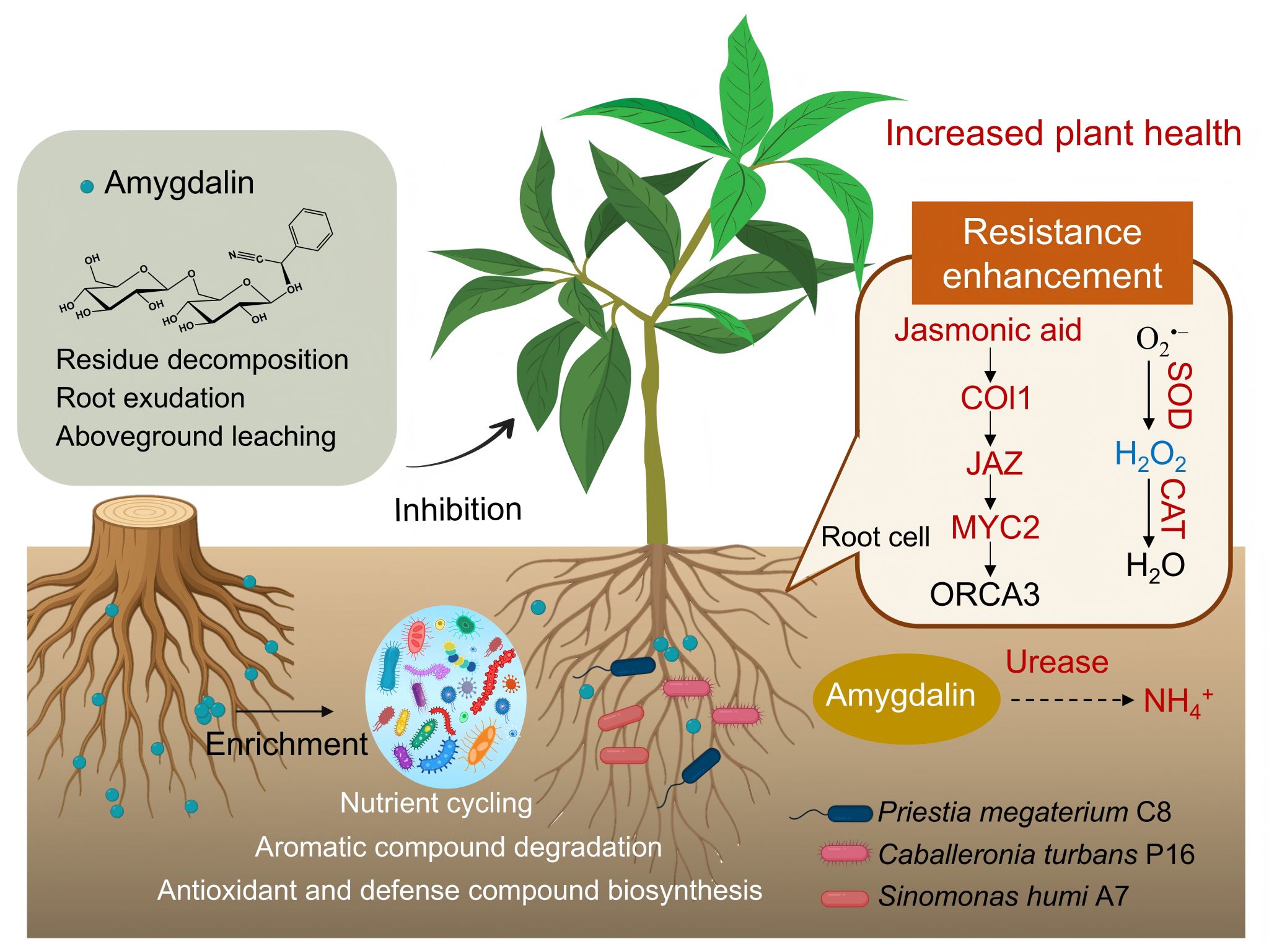 团队从桃苗根际分离筛选出3株代谢功能互补、耐受性强且互不拮抗的高效菌株,可显著缓解扁桃苷对桃苗的抑制作用;其中三菌共同接种效果最优,展现出显著的协同解毒优势。进一步的机制研究揭示,功能微生物通过三重通路协同发挥作用:一是在根际土壤中促进扁桃苷降解与氮素循环,将有毒物质转化为植物可利用的铵态氮;二是激活桃树茉莉酸的合成和信号转导,提升植株整体抗逆水平;三是维持植株氧化还原稳态,减轻连作胁迫造成的氧化损伤。该成果从根际微生态视角全新阐释了桃树连作障碍的形成与修复机制,不仅深化了多年生植物-微生物互作的理论认知,更直接对接产业问题,为研发桃树专用抗连作功能菌肥、生物菌剂提供了核心菌株与技术靶点,推动桃树轻简化、绿色化、高效化栽培模式的落地应用。