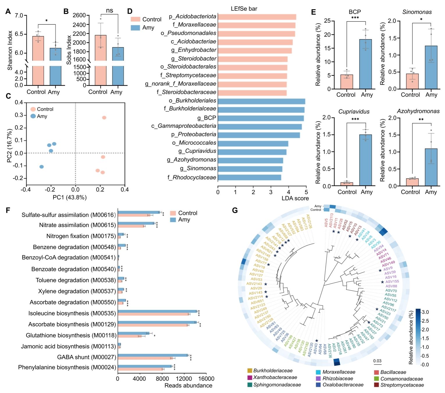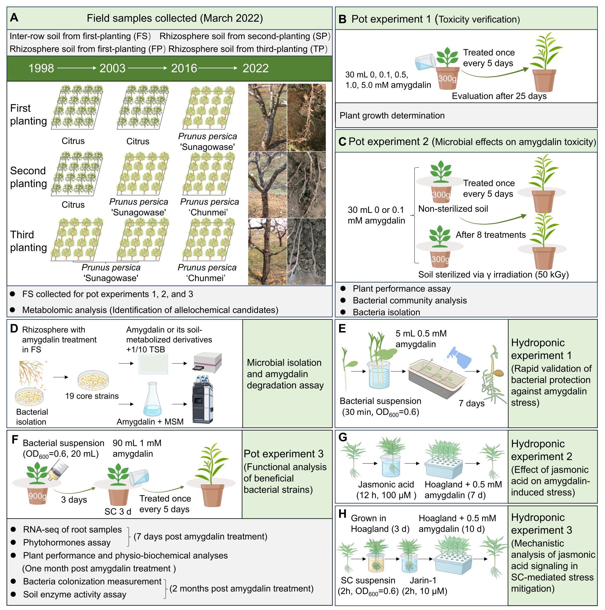 研究通过对三个不同连作茬次桃园根际土壤的非靶向与靶向代谢组分析,锁定了扁桃苷这一关键自毒物质。其含量随连作茬次增加而持续累积,直接抑制桃苗生长发育;进一步灭菌与未灭菌土壤对比试验表明:扁桃苷在灭菌土壤中对桃苗的抑制效应更为显著,表明土壤微生物是桃树抵御自毒胁迫的重要屏障;根际微生物群落分析与体外验证显示,扁桃苷对植物产生毒害作用的同时,能够重塑根际细菌群落结构,定向富集Burkholderia-Caballeronia-Paraburkholderia、Sinomonas等关键功能类群,从而缓解扁桃苷胁迫。