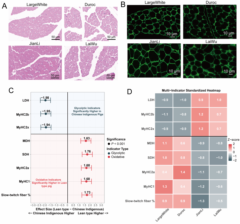 为回答这一问题,研究团队以 2 周龄瘦肉型猪(大白猪、杜洛克)和中国地方脂肪型猪(监利猪、莱芜猪)背最长肌为研究对象,首先从组织学和分子表型层面刻画了两类猪的早期差异图景。结果发现,在这一发育阶段,瘦肉型猪背最长肌的肌纤维平均直径和横截面积更小(图1A、B),但慢肌/氧化型相关特征更加突出,表现为更高比例的 MyHC1 阳性肌纤维,以及更高水平的 MyHC1、MyHC2a、SDH 和 MDH 等氧化代谢相关指标;相比之下,2周龄中国地方脂肪型猪背最长肌则呈现出更明显的 MyHC2b、MyHC2x 和 LDH 等糖酵解型特征(图1C、D)。这表明,在出生后不久,不同猪种便已沿着不同的肌纤维类型启动了各自的发育路径。