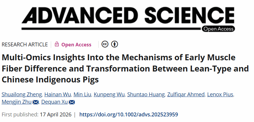 南湖新闻网讯(通讯员 郑帅龙)猪肉品质为何会在生长早期就埋下分化的“伏笔”?在看似相似的骨骼肌中,不同品种猪为何会走上不同的肌纤维发育轨迹?这一问题不仅关乎动物发育生物学的基础认知,也直接影响肉品质形成与遗传改良。近日,我校猪遗传育种团队在国际期刊 Advanced Science 在线发表题为 Multi-omics Insights into the Mechanisms of Early Muscle Fiber Difference and Transformation between Lean-type and Chinese Indigenous Pigs 的研究论文。该研究围绕瘦肉型猪与中国地方脂肪型猪出生后早期肌纤维差异形成机制这一关键科学问题,整合 RNA-seq、ATAC-seq、ChIP-seq、WGS 和 Hi-C 等多组学数据,系统揭示了表观组与三维基因组协同调控猪肌纤维类型的分子机制。