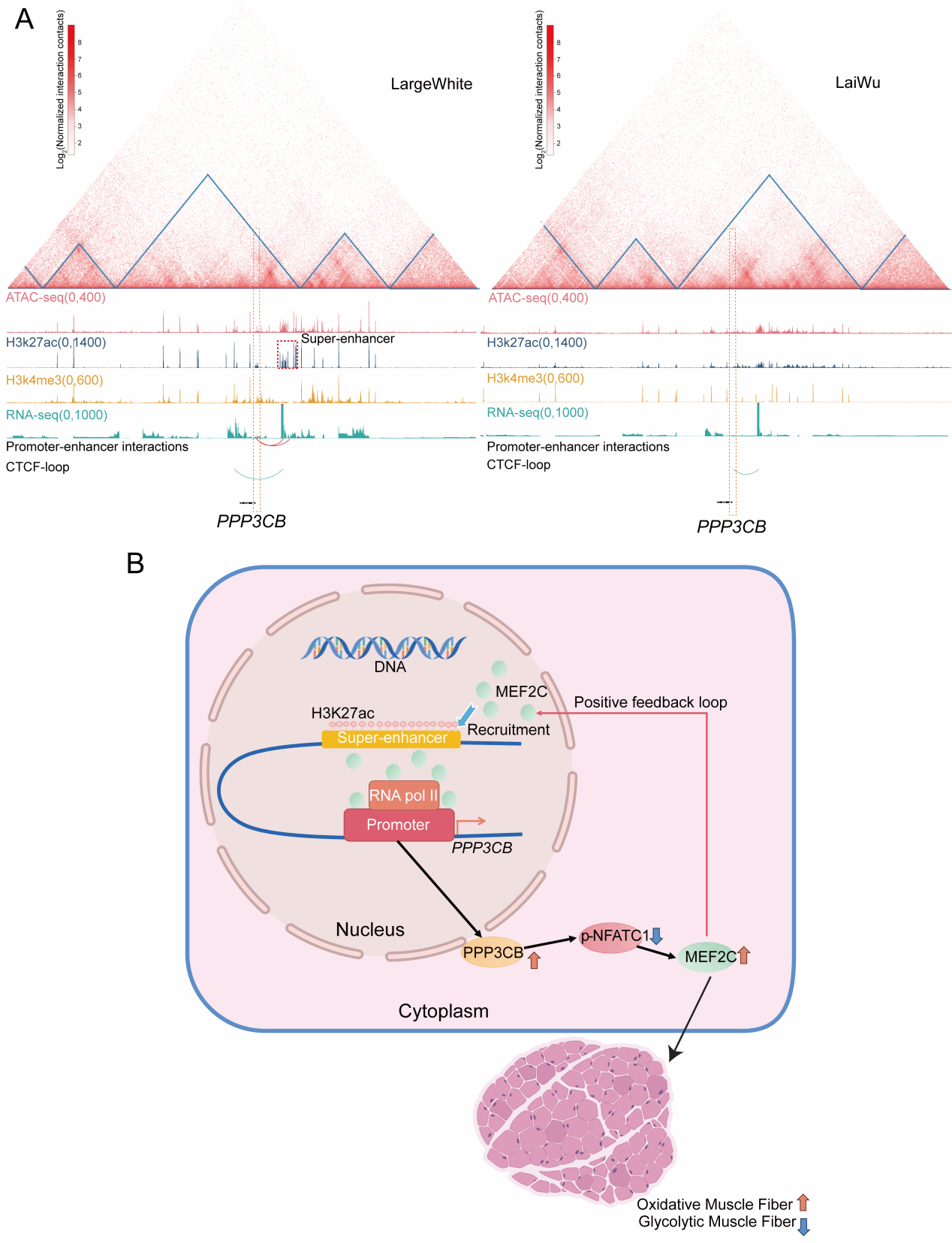 Skeletal muscle fiber composition is a key determinant of meat quality and metabolic traits. The early postnatal period constitutes a primary window for muscle fiber transformation. In this study, distinct muscle fiber composition is analyzed by histological and molecular characterization of longissimus dorsi muscle of two-week-old lean-type and Chinese indigenous pigs. Multi-omics analyses reveal divergence in chromatin states, enhancer landscapes, and promoter activity between breeds. Lean-type pigs show increased chromatin accessibility and enhancer activation at genes involved in oxidative metabolism and myogenesis, whereas Chinese indigenous pigs exhibit enriched regulatory features at glycolytic and biosynthetic loci. Breed-specific SNPs and indels are enriched in a subset of enhancers and potentially influence transcriptional regulation. Higher-order genome architecture further contributes to transcriptional divergence through A/B compartment switching and topologically associating domain boundary remodeling. Promoter–enhancer interaction mapping reveals breed-specific cis-regulatory networks, and transcriptional output correlates with enhancer density. Functional validation identifies a super-enhancer upstream of PPP3CB that recruits MEF2C to activate oxidative fiber programs. In vitro and in vivo perturbation assays confirm that the PPP3CB–MEF2C feedback loop governs muscle fiber-type specification. Collectively, these findings delineate the epigenomic and 3D genomic architecture underlying early muscle fiber characteristics and provide mechanistic insights relevant to improving meat quality.