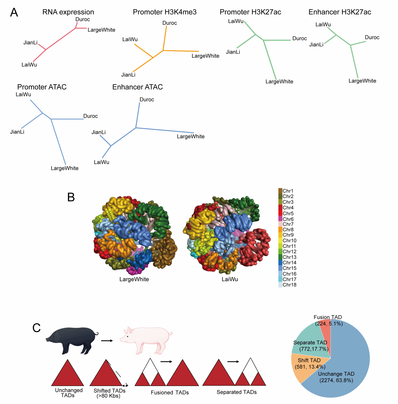 图2.两周龄瘦肉型猪与中国地方脂肪型猪背最长肌表观组及三维基因组学分析