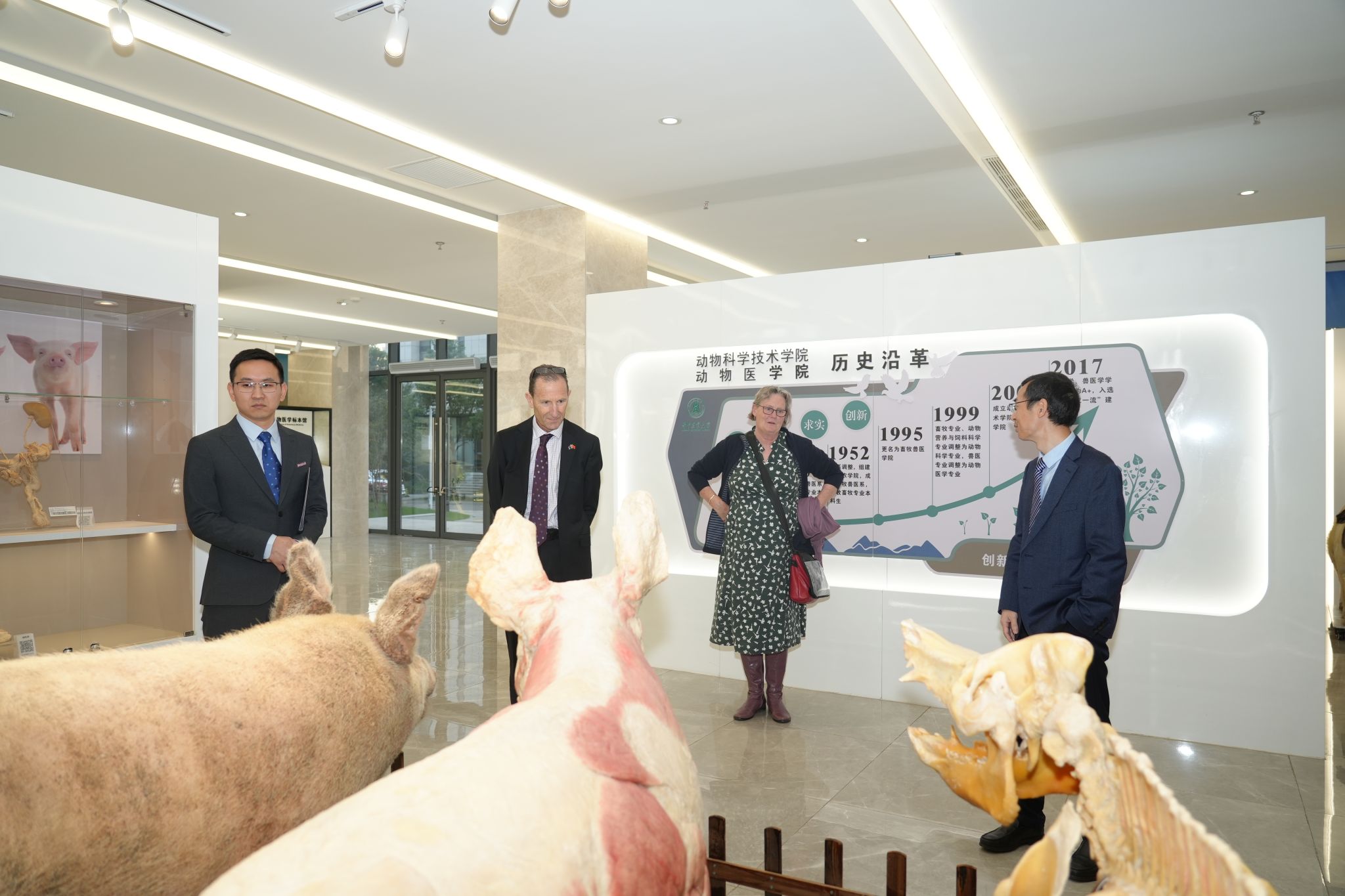 访问期间,代表团一行参观了我校教学动物医院、第四综合楼教学科研平台、标本馆、生猪生物育种产教融合创新平台和实验动物中心,全面了解我校在动物科学、智慧养殖等领域的教学科研设施与创新成果。
