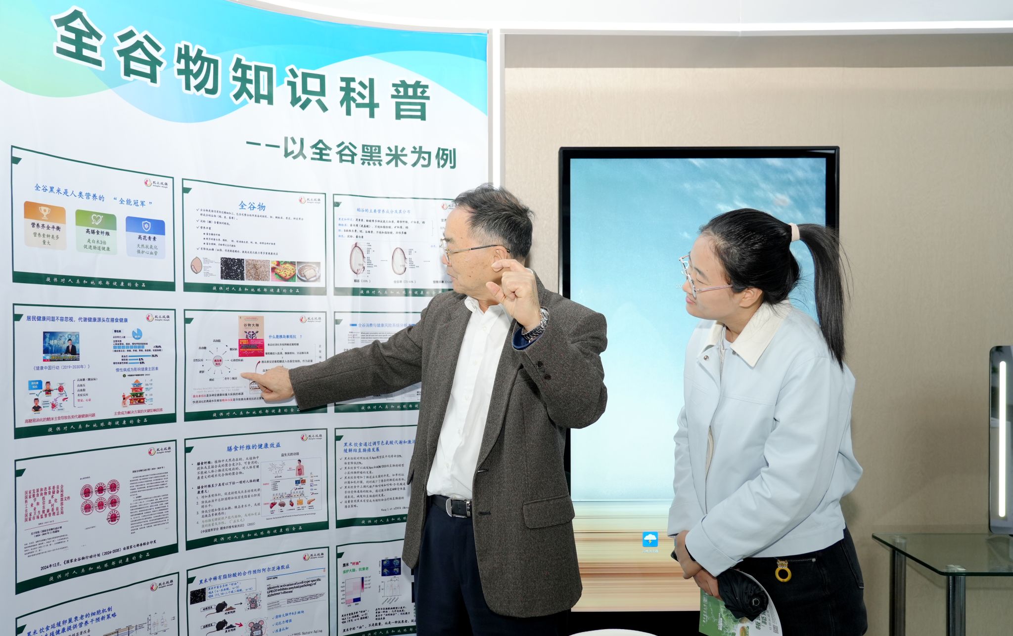 张启发院士在功能性食品展厅介绍全谷黑米有关情况(记者 匡敏 摄)