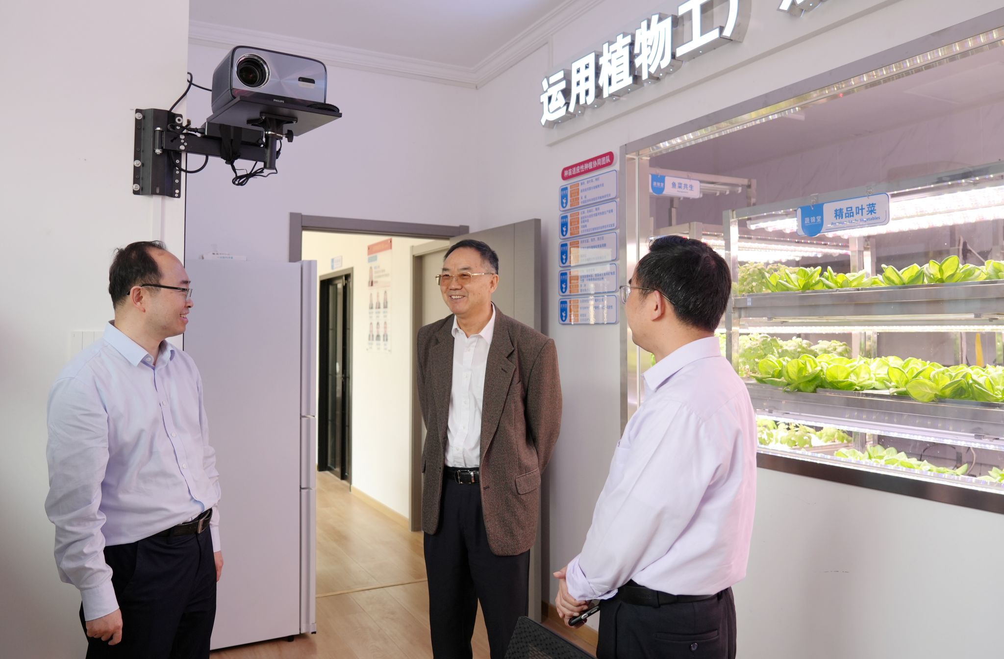在马昌营镇王官屯村科技小院,植物工厂内,智能计算机和电子传感系统协同作业,对植物生长的温度、湿度、光照、CO2浓度以及营养液等环境条件进行自动控制,一丛丛娇嫩欲滴的蔬菜长势喜人。张启发院士一行在此调研了植物工厂“AI光配方”与分时补光的工作机制,并与马昌营镇镇长刘伟共话未来农业发展新形态。
