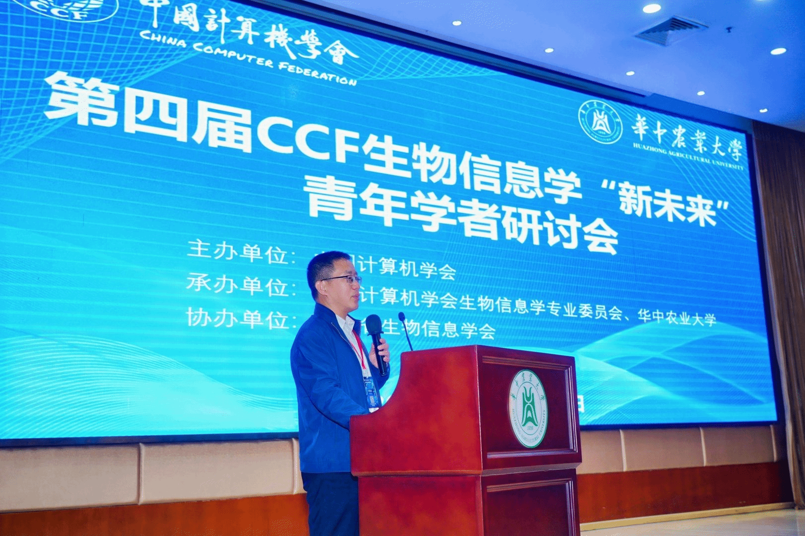 开幕式于2026年4月25日在国际交流中心一楼报告厅举行,华中农业大学副校长杨少波教授、CCF生物信息学专委会高琳教授和信息学院院长李国亮教授分别致辞。大会由李国亮教授、高琳教授、北京理工大学张法教授以及信息学院副院长章文教授主持。