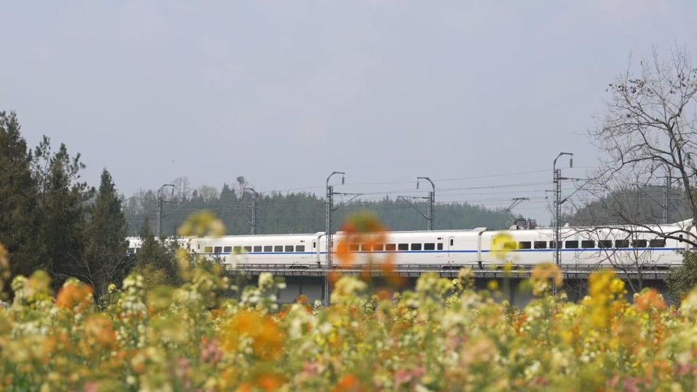 安乐井社区,动车从“花海”间驶过(新华社 发)