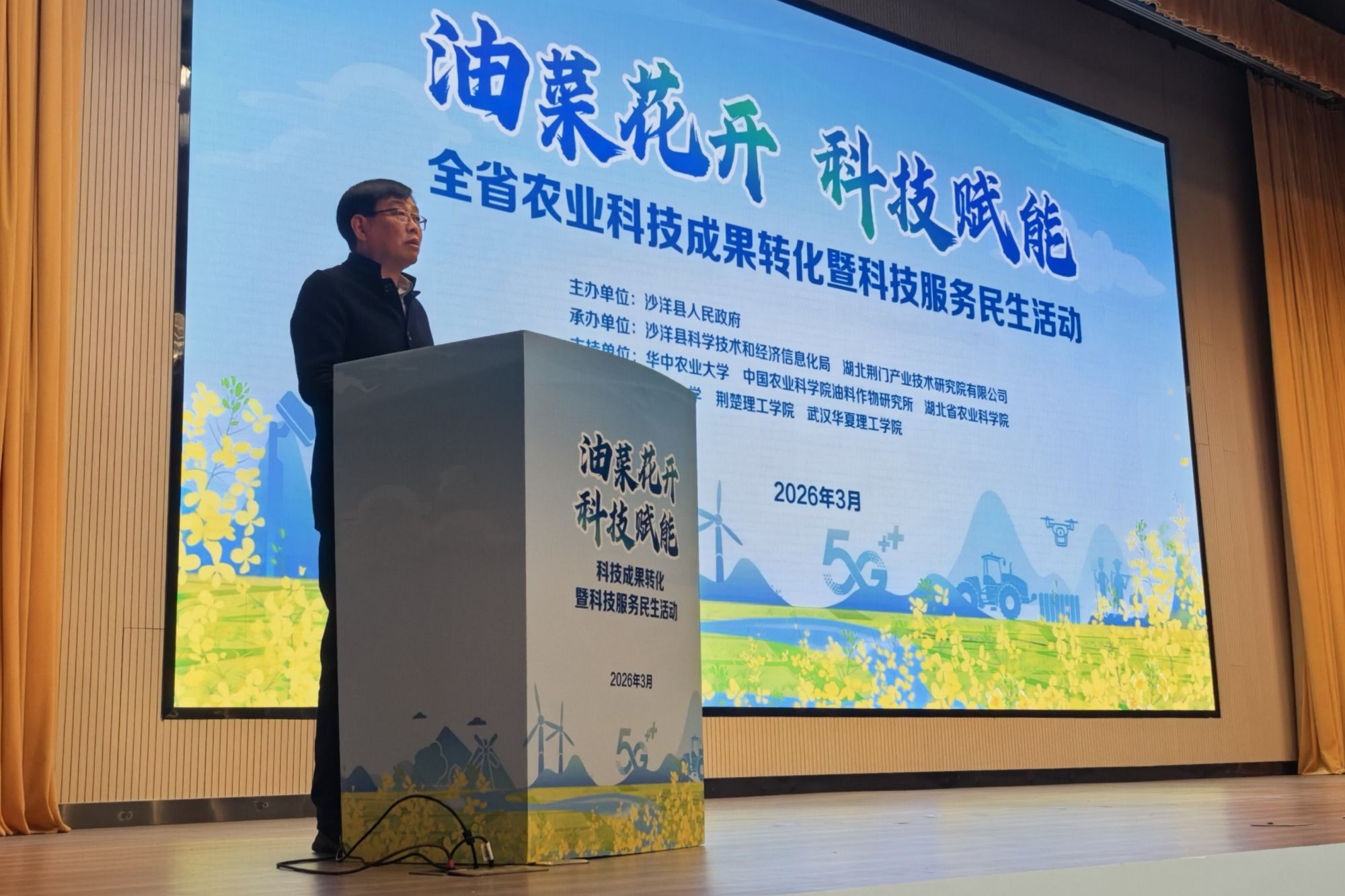 作为本届油菜花节的重要部分,3月18日下午,“油菜花开·科技赋能”全省农业科技成果转化暨科技服务民生活动在荆门乡村振兴学院举行。郭刚奇在致辞中表示,30多年来,傅廷栋院士团队始终将沙洋县作为油菜新品种培育与新技术推广的“主战场”,深厚的产学研积淀成就了“世界油菜看中国,中国油菜看湖北,湖北油菜看沙洋”的行业美誉。他指出,学校愿与沙洋县继续携手同行,持续开展“乡村振兴荆楚行”等活动,将科技成果的“种子”培育成产业发展的“硕果”,为沙洋农业产业升级和乡村振兴贡献更多智慧和力量。
