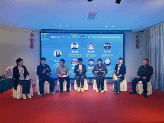 “社工介入·化纷止争——社会工作参与基层矛盾纠纷调解实践”圆桌论坛由西南石油大学法学院MSW中心主任谭祖雪教授主持,南宁市和悦社会服务研究与评估中心主任冯莉、深圳市龙岗区正阳社会工作服务中心服务副总干事张杰、成都焕然社会工作服务中心副总干事周润芝、成都市郫都区瑞泽社会工作服务中心项目负责人李捷、昆山市和光社会工作发展中心总干事李金龙、成都壮成社会工作服务中心负责人易泽辉围绕社工参与基层矛盾纠纷调解的实践案例、角色、路径、方法与成效等话题进行了分享与讨论。