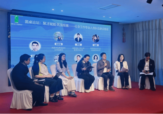 主题报告结束后,本次专题研讨会依次开启五场圆桌论坛。其中,“聚才赋能·筑强根基——社会工作专业人才队伍建设路径”圆桌论坛由中共凉山州越西县委社会工作部副部长张乐江主持,西昌学院彝语言文化学院助教杨柳喜,成都市同行社会工作服务中心副总监罗超、宜宾学院法学与公共管理学院社会工作专业讲师赵茜、嘉应学院法学与公共事务学院院长陶叡教授、福州市长乐区社会工作服务中心主任陈家辉、深圳市龙岗区正阳社会工作服务中心总干事杨成分别围绕当前社会工作专业人才的学科教育、实务运用、培养方向及本土需求进行了深入交流与讨论。