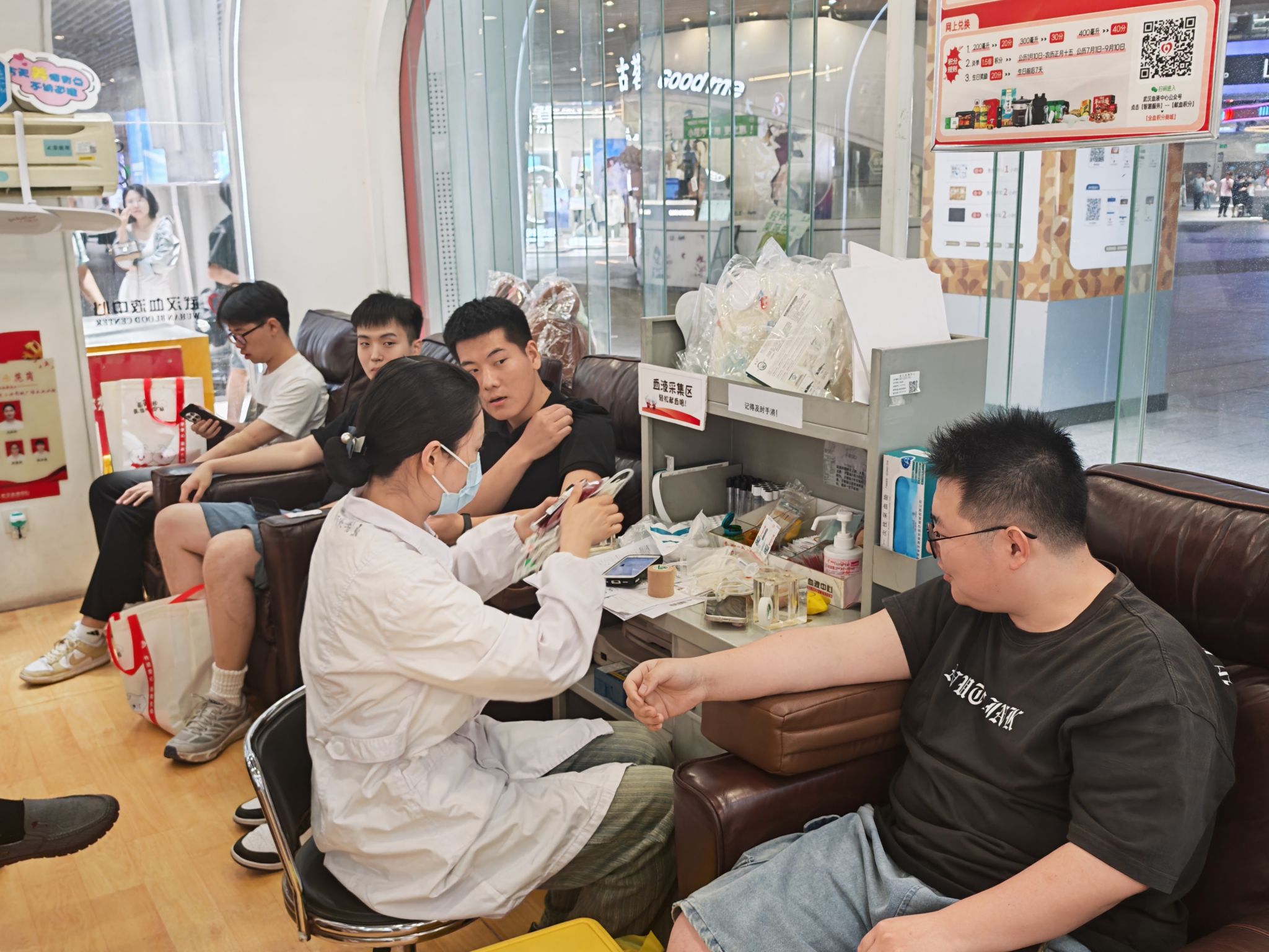 此时,2022级风景园林硕士研究生闫昱升正在用人单位实习,看到消息后他放下手中的报表,请假赶到献血站;2024级蔬菜学硕士研究生张杨刚刚从荆门的学术会议返汉,匆匆卸下行李后直奔献血点;2024级农艺与种业硕士研究生娄泽岳是王同学的本科好友,400 cc的血液注入血袋的时候,他也向王同学表达祝福。还有硕士研究生李诚智、刘一凯、徐涛、张怀坤和学院辅导员克木老师等也陆续加入,他们依次完成检测、登记、采血和输血。短短一个上午,师生总计献血量已达2000cc,鲜红的血液串联起生命的接力,凝聚着师生的牵挂。