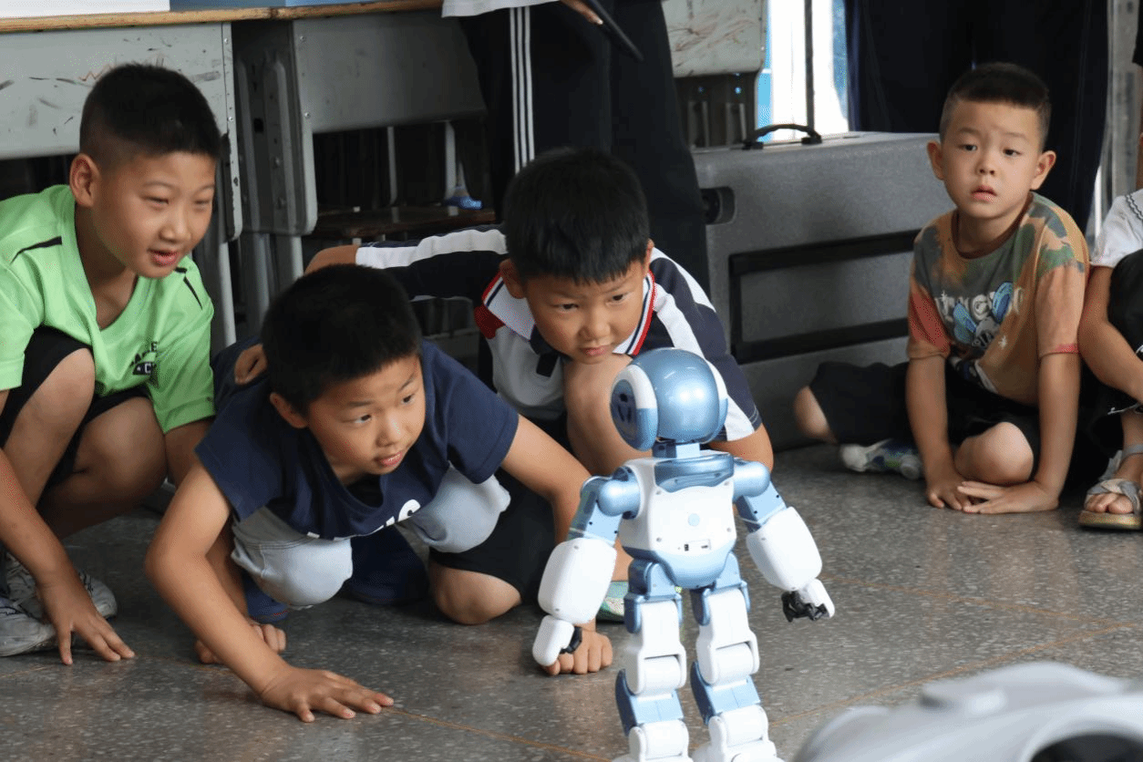 动感音乐中,人形机器人整齐起舞、智能机器狗灵活展示高难度动作,引得孩子们阵阵惊呼与热烈掌声,大家争相与机器互动,近距离感受人工智能的魅力;“飞舞小球”“有趣的透镜”“三维磁感线”等十余件涵盖物理、光学等原理的互动展品前更是人头攒动,孩子们亲手操作、兴致盎然,身着红马甲的支教队员和科普志愿者则穿梭其间,用通俗易懂的语言讲解,让抽象的科学原理变得生动可感。