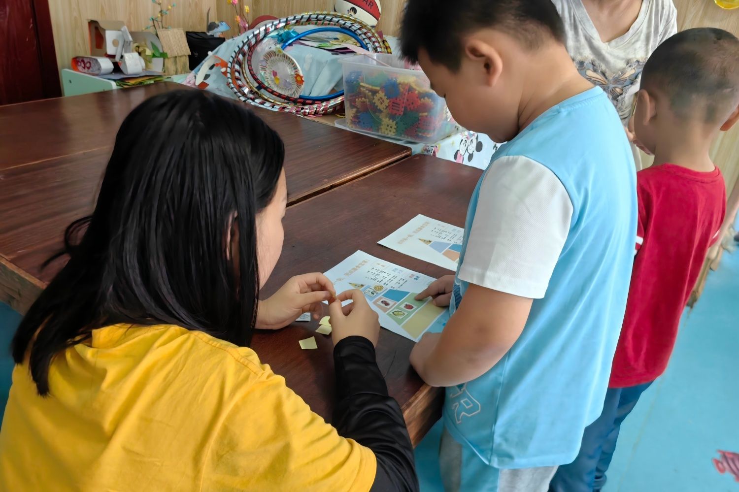 队员孙佳婧指导小朋友在膳食宝塔中贴食物(通讯员 詹淘淘 摄)