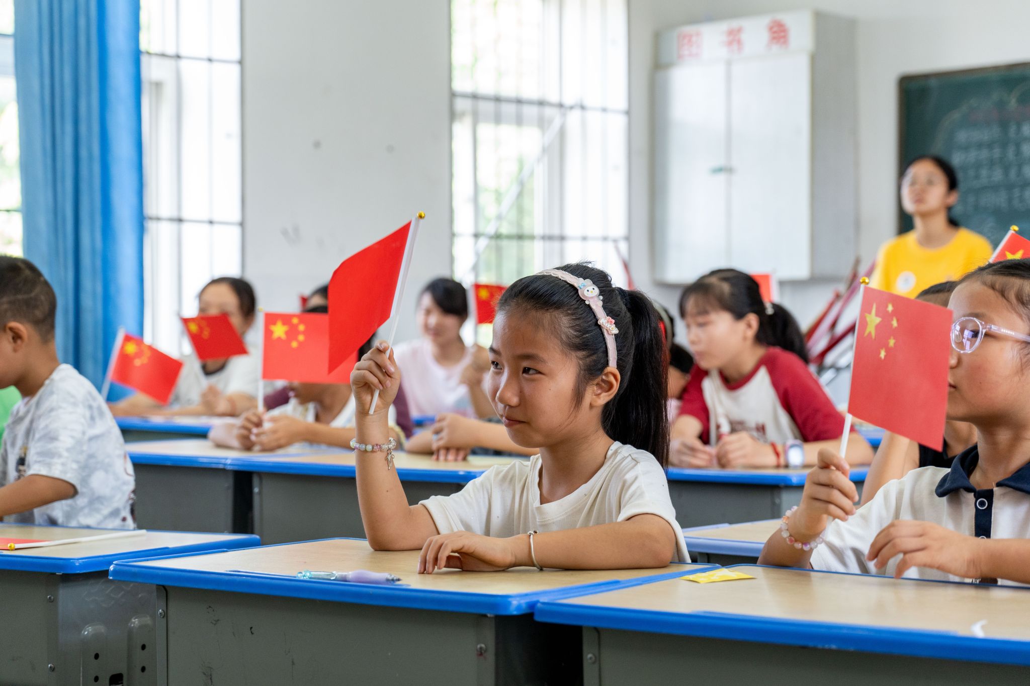 同学举着自制国旗认真听讲