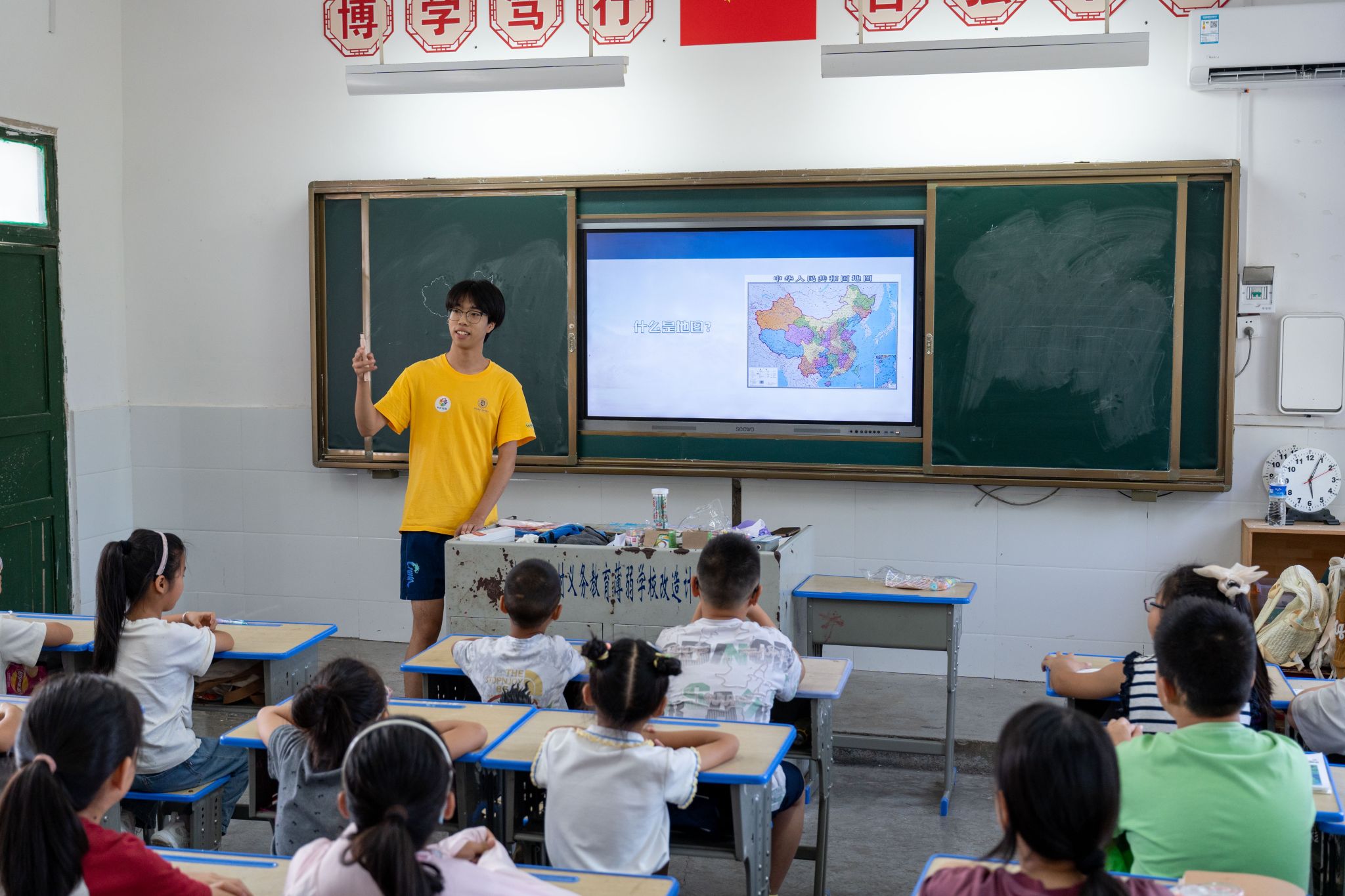 志愿者宋金曌向孩子们介绍中国地图