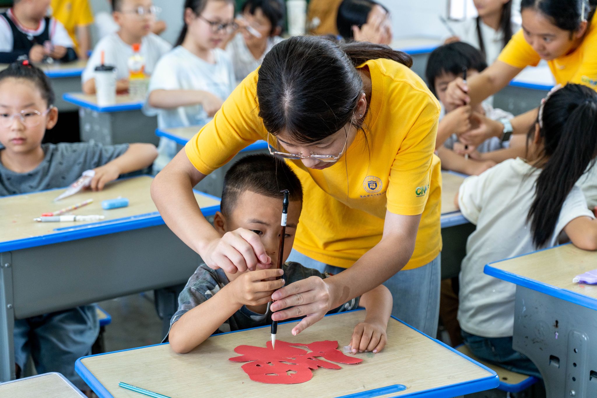 “老师你看我的‘福’字!” 暑期课堂里,一年级学生文浩然举着作品欢呼。这个平时活泼好动的孩子,此刻正专注地修饰着剪纸边缘。