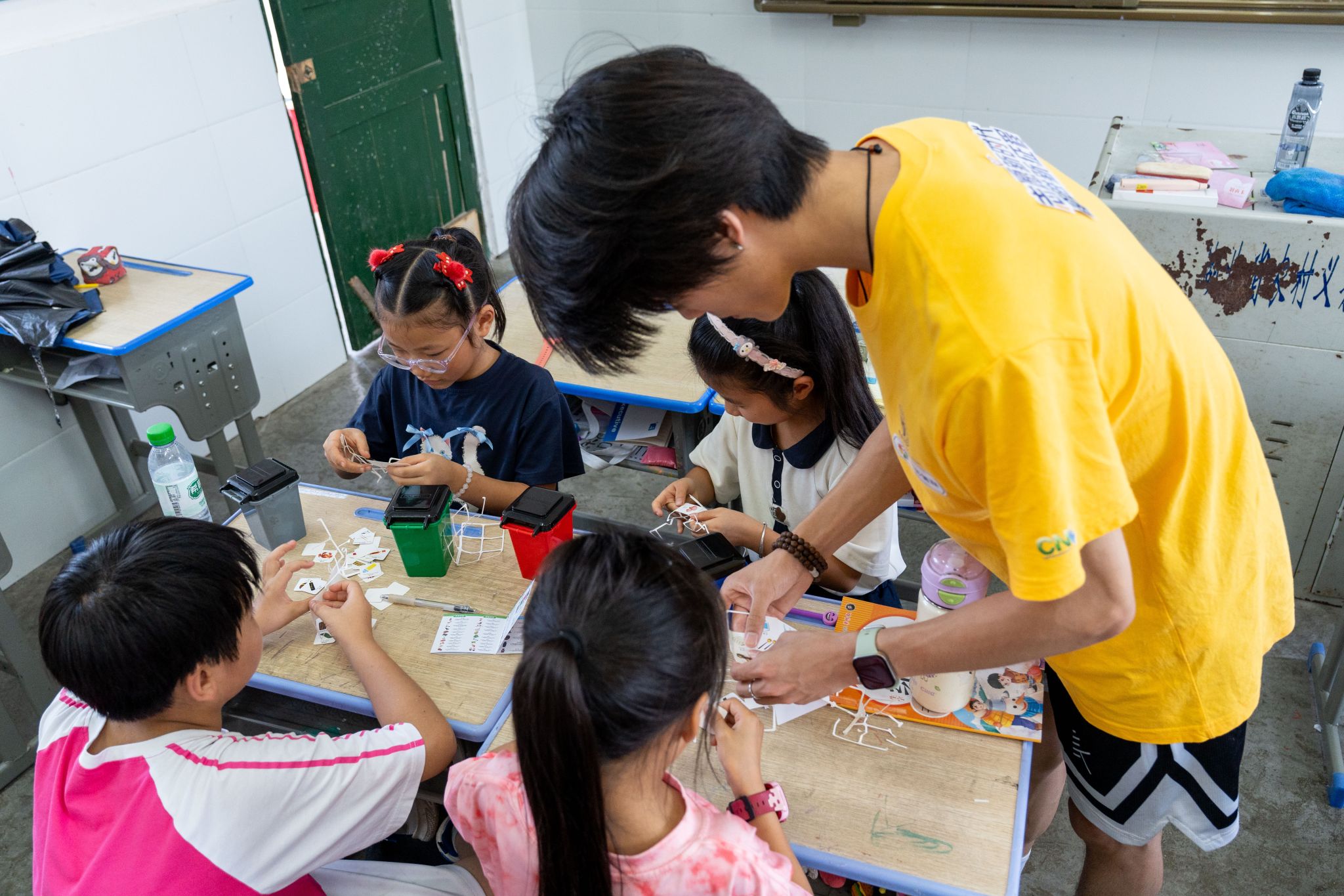 志愿者赵帅与孩子们共同完成垃圾分类小游戏