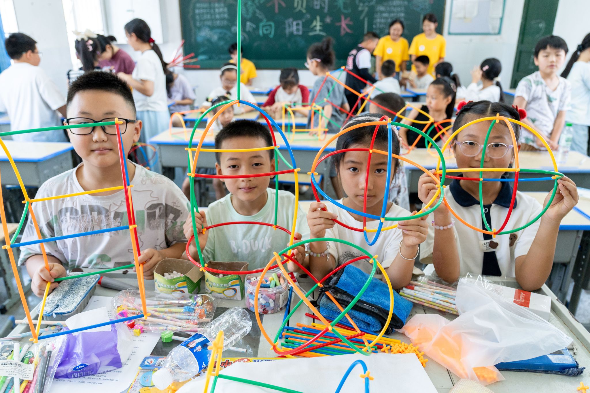 在“小吸管搭世界”环节,孩子们化身为小小工程师。他们用彩色吸管搭建桥梁、房屋,在实践中学习力学知识。“我们组的塔最高!”孩子们兴奋地展示成果。