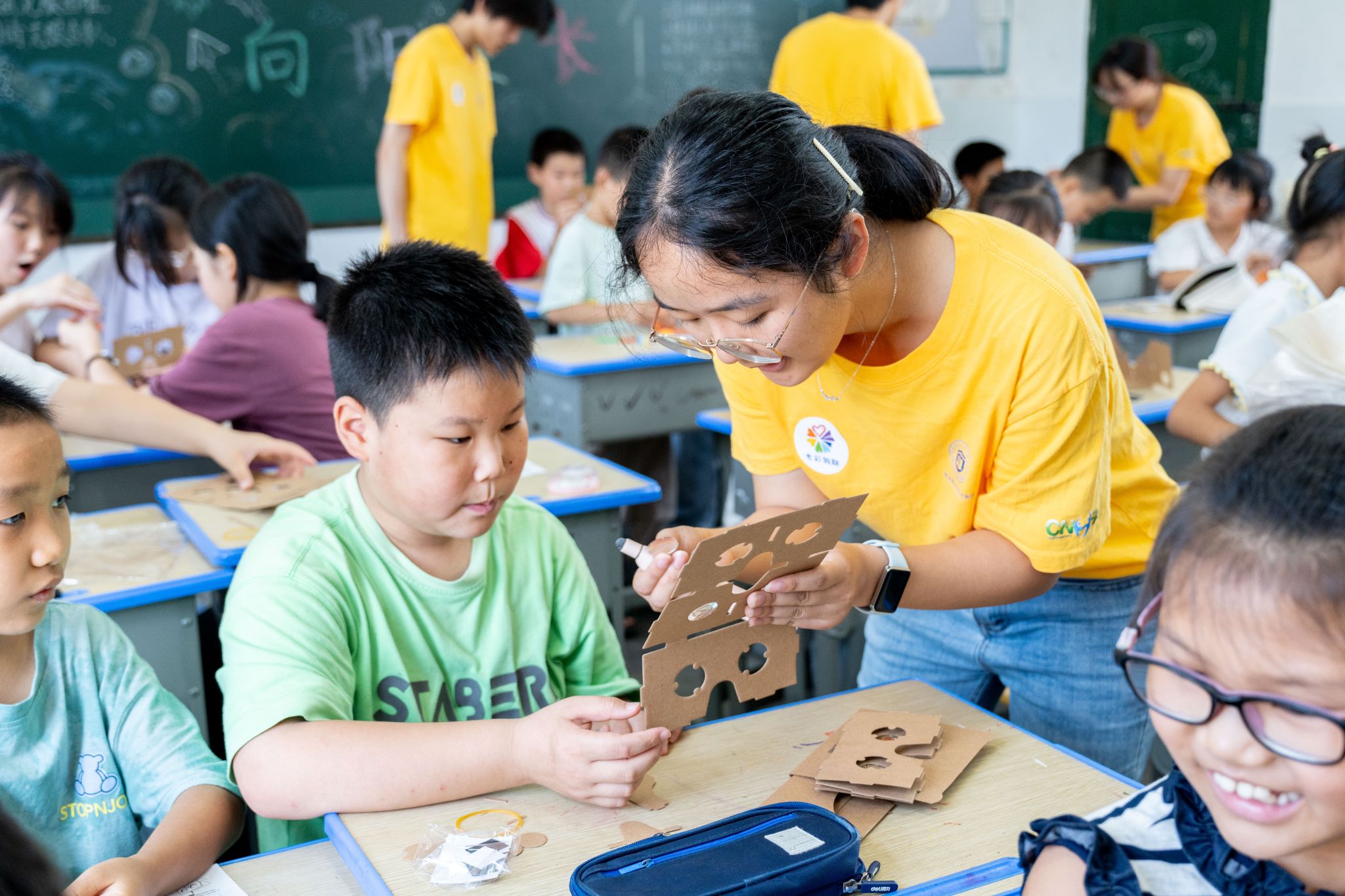 志愿者汤子婕帮助同学完成VR眼镜制作