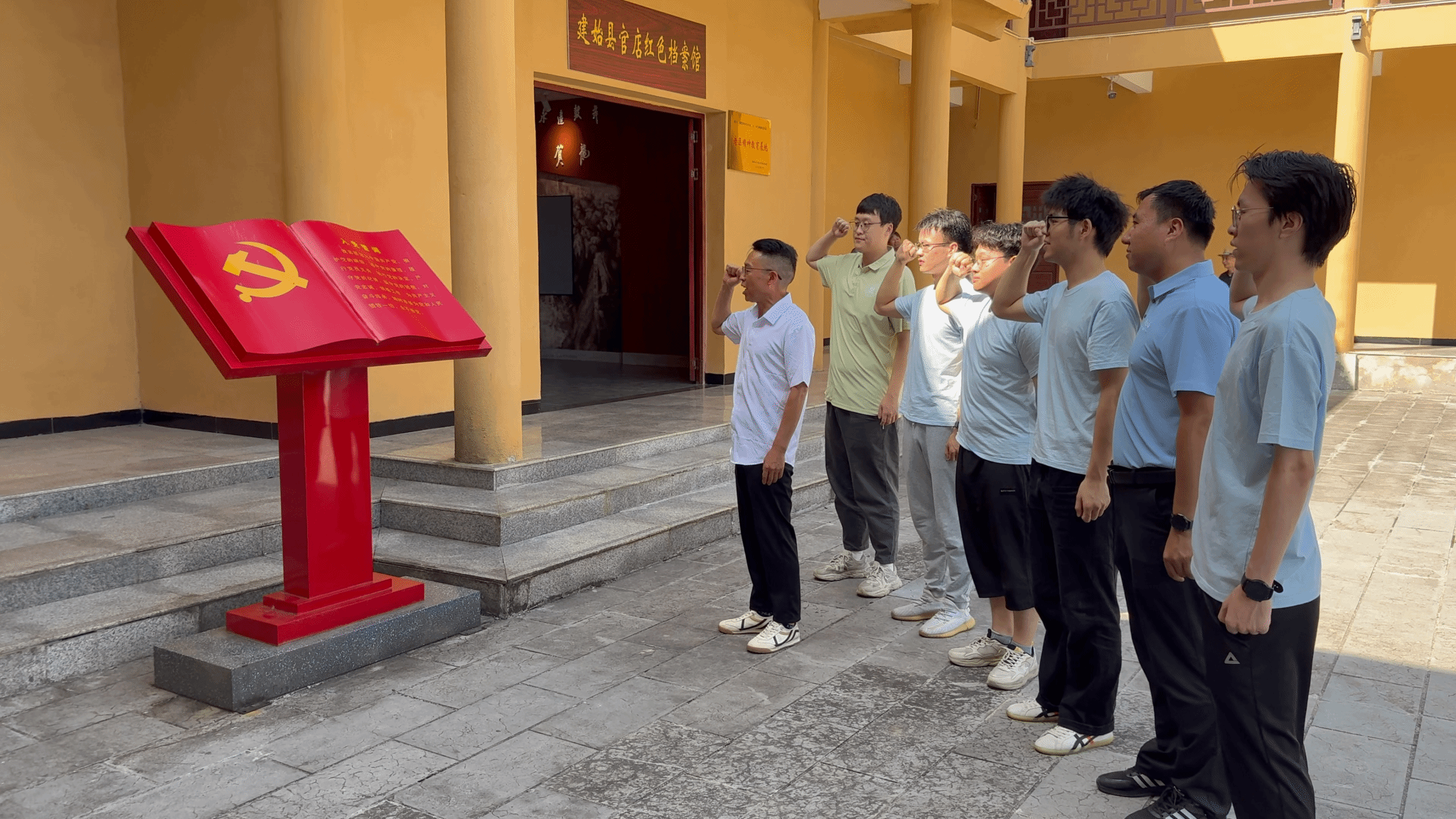 实践团成员重温入党誓词合影参观官店革命历史陈列馆(通讯员 孙圣杰 摄)