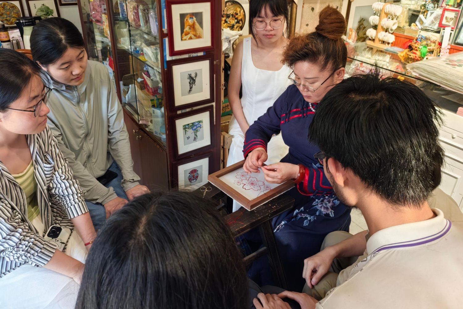 南湖新闻网讯(通讯员 勾志俨)7月25日至31日,华中农业大学园艺林学学院赴湖北省武汉市汉绣传承暑期社会实践团来到位于武汉昙华林的汉绣艺社,拜访汉绣传承人沈昌慧,倾听她讲述在刺绣艺术中独具荆楚风华的汉绣文化,并亲身学习汉绣针法,为这位在《楚辞》“被文服纤,丽而不奇些”的吟唱中昂首迈向现代的传统技艺再递一把火炬。