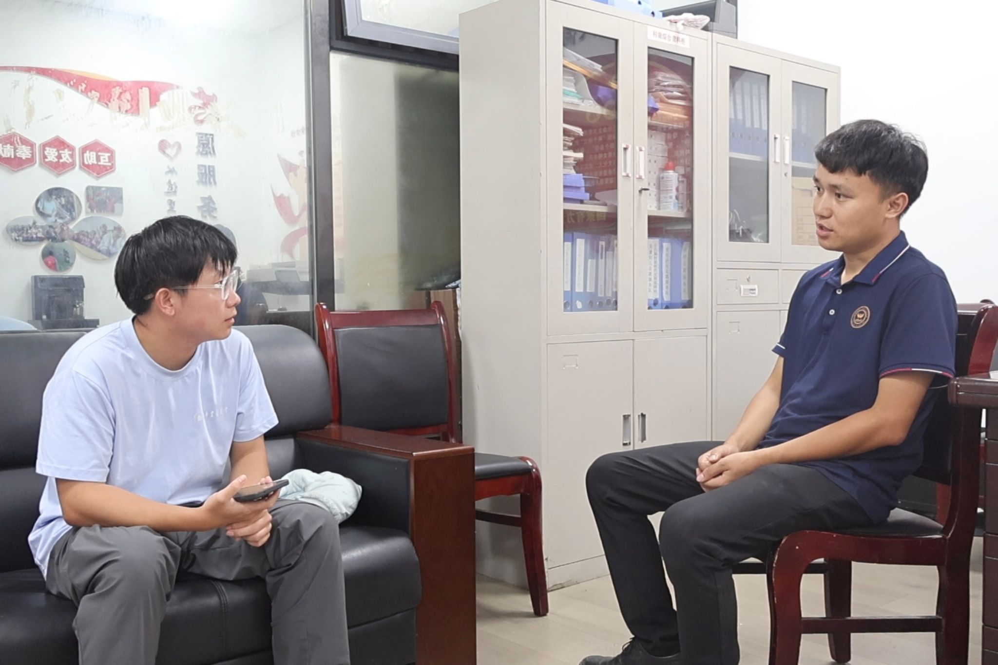 团队成员贺建锟在采访十八洞村团支部书记施康(郭昊宇 摄)