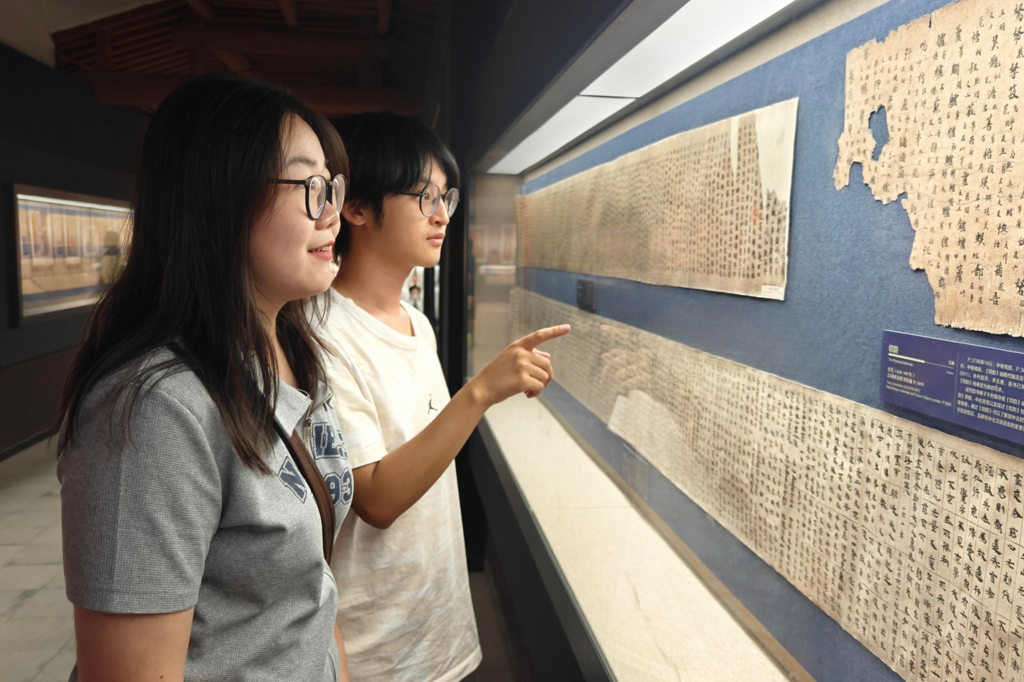 实践团成员观察藏经洞文物 (通讯员 倪茁斌 摄)