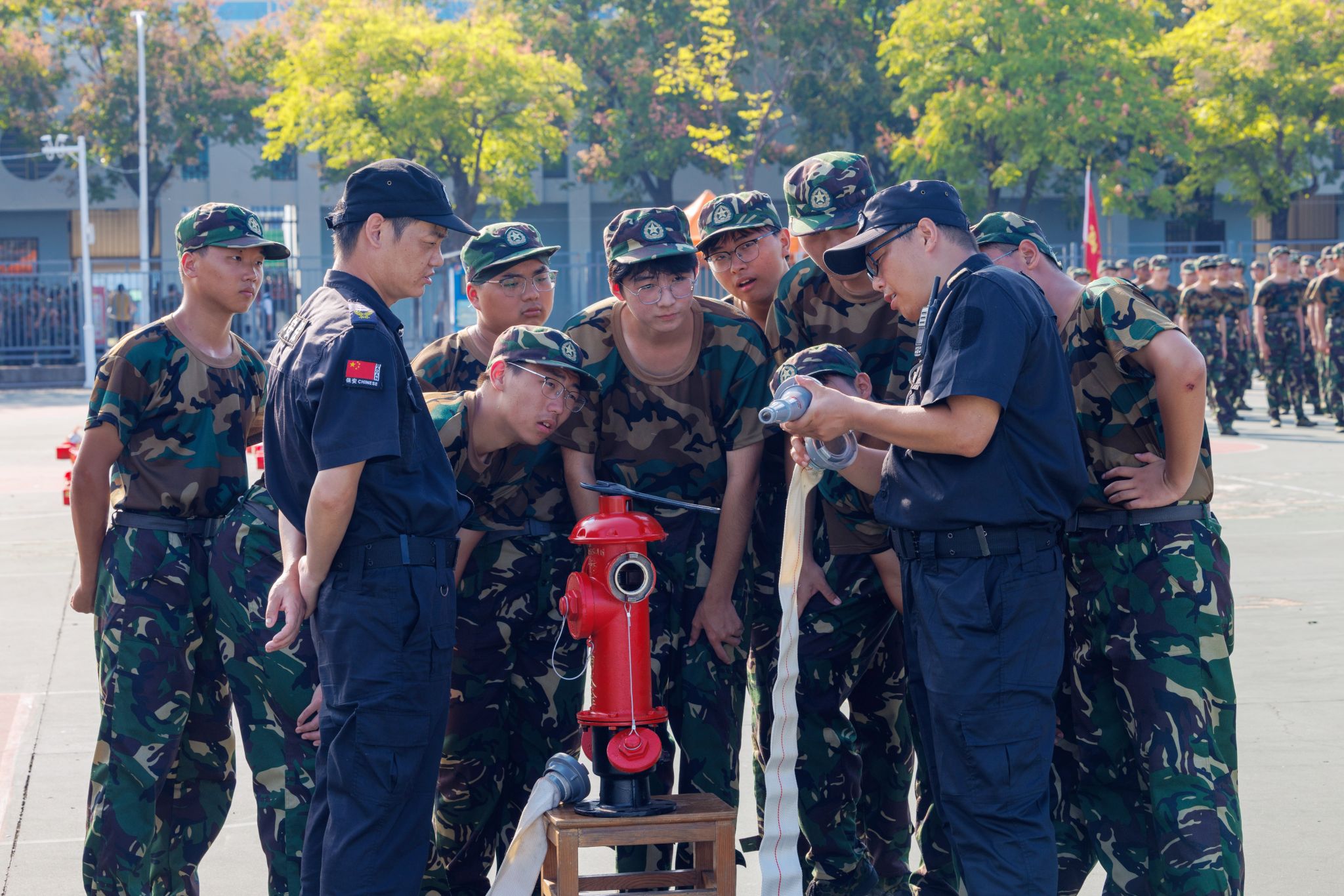 ▲工作人员向同学们讲解消防栓的正确使用(学通社记者 何冠丽 摄)