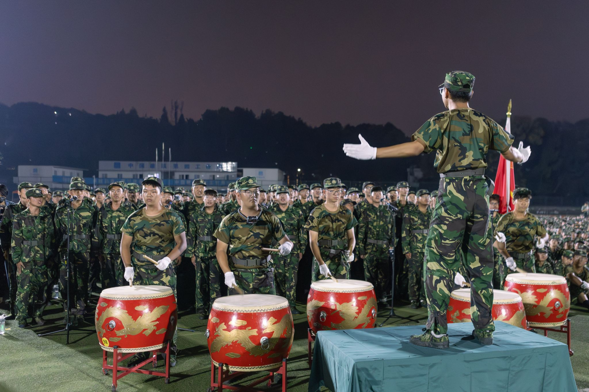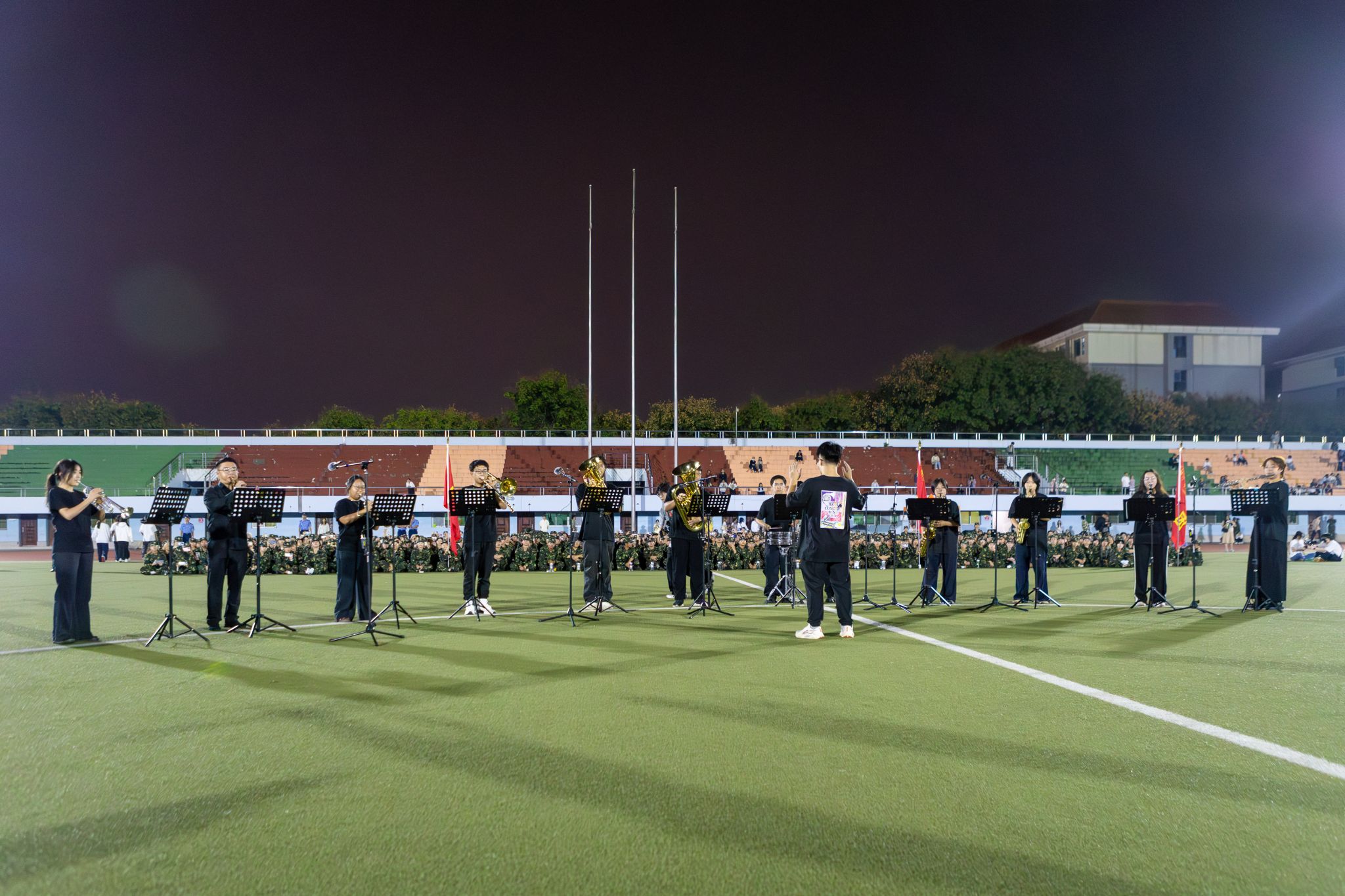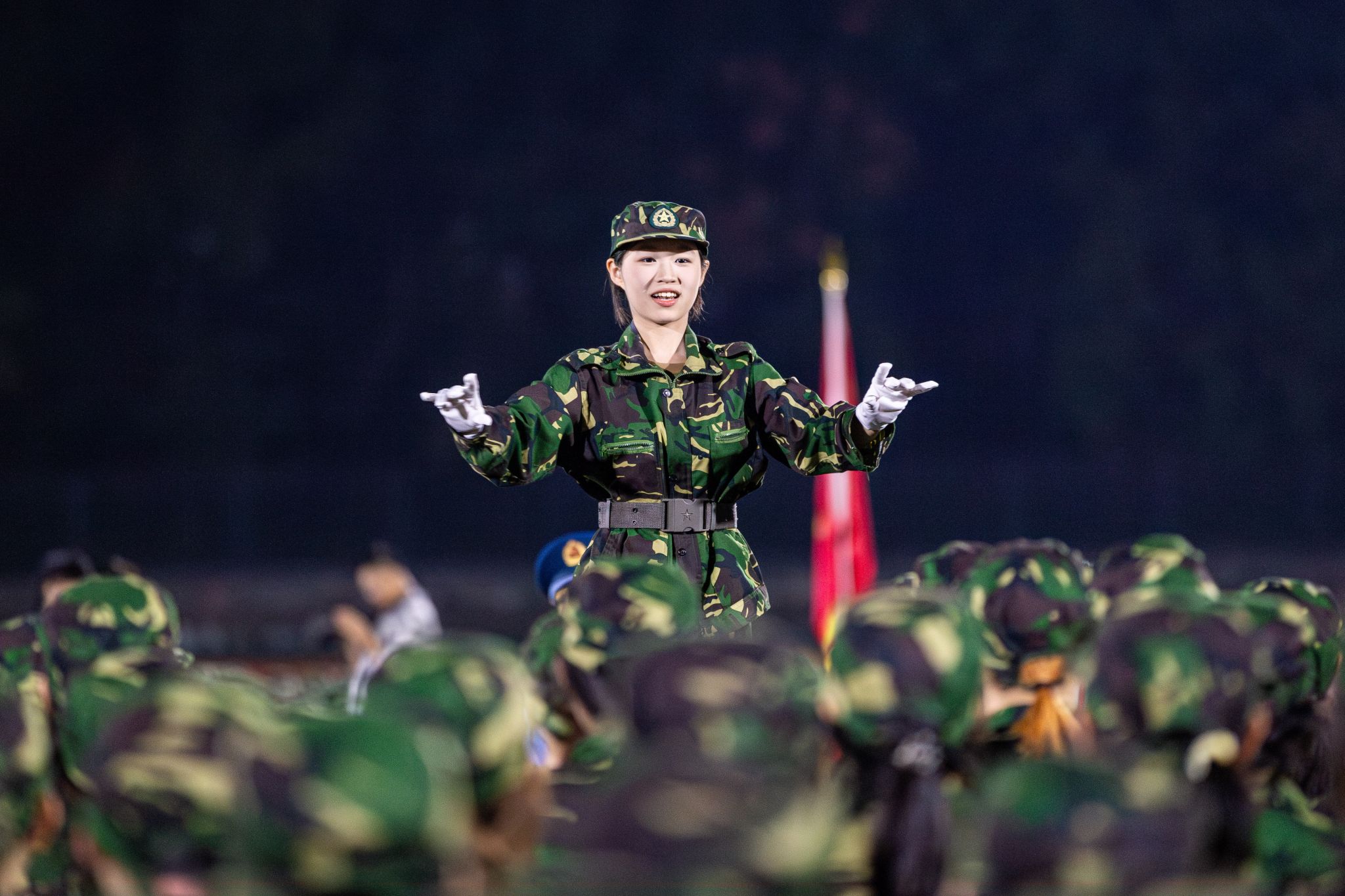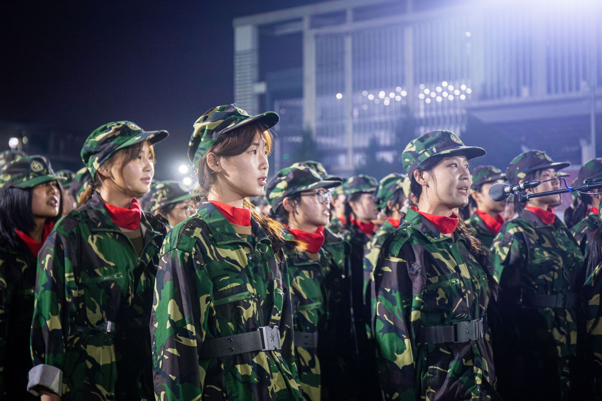 细雨霏霏,清风拂面。东运动场上灯光如昼,十五面鲜红的团旗迎风招展,军训师十五个团分成了红蓝两队,呈“八一”字样排布于场地中,各阵营严阵以待,紧张而热烈的氛围弥漫现场。空军预警学院李文博教官、张弓良教官和园艺林学学院辅导员董晓玲、工学院辅导员李雨霏担任青春歌会主持人。