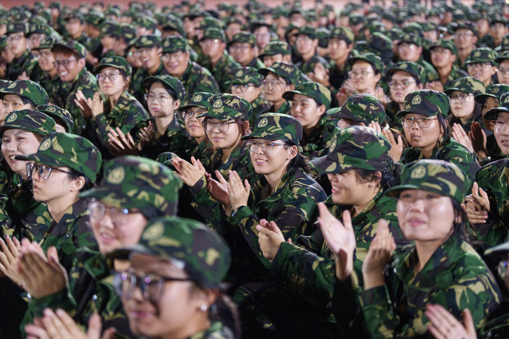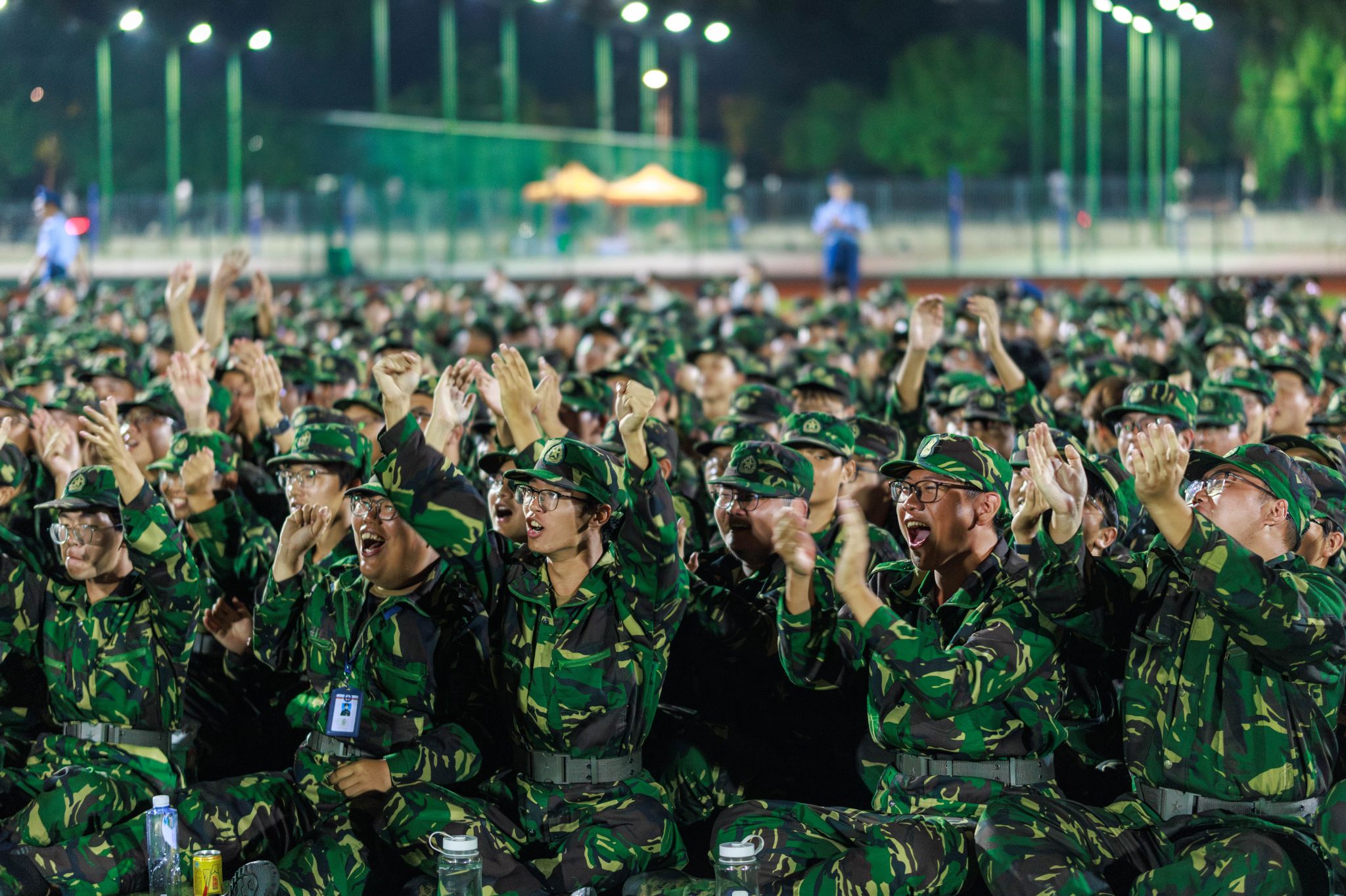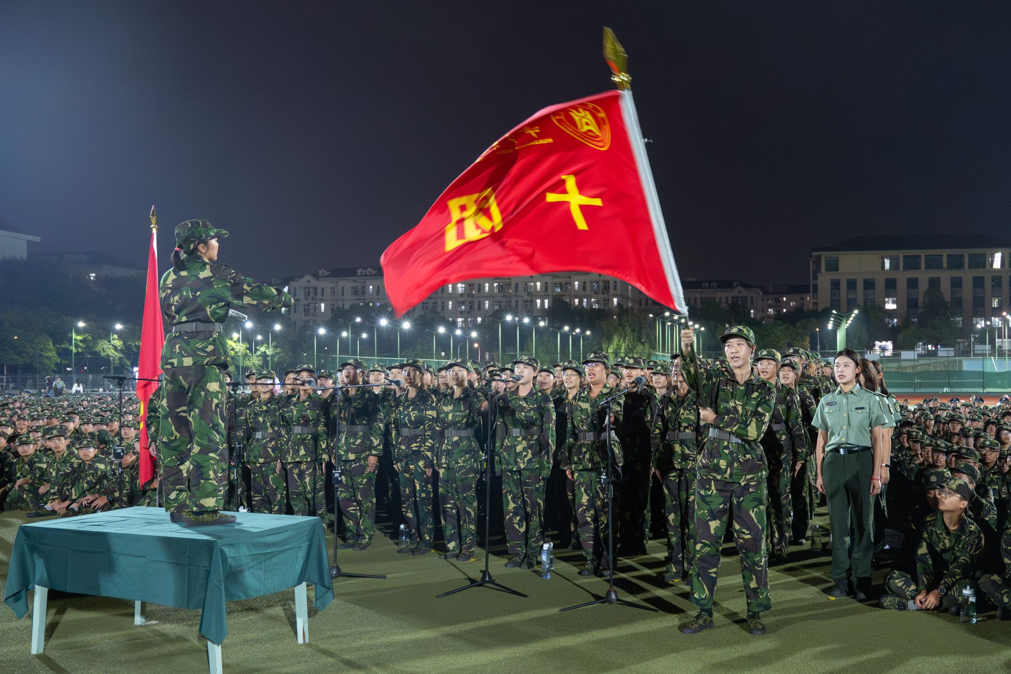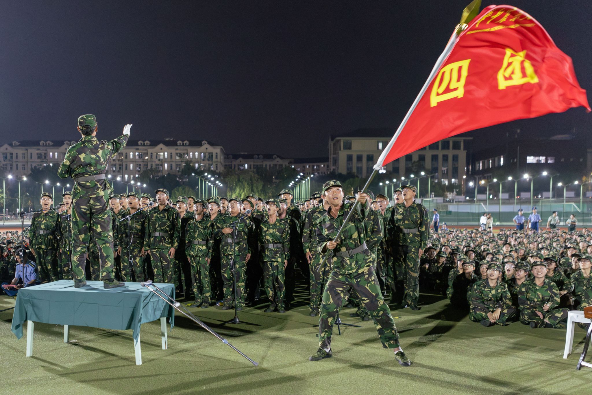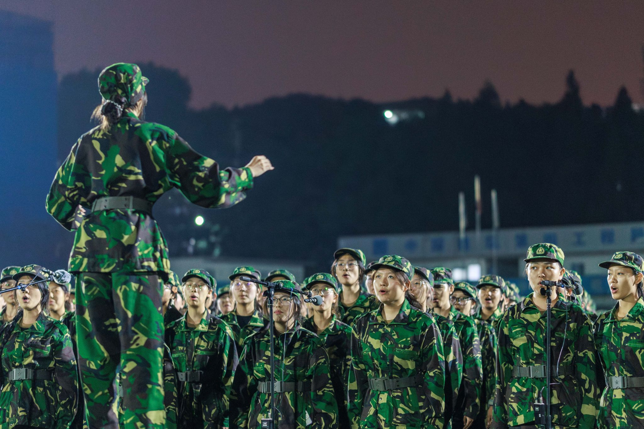 细雨霏霏,清风拂面。东运动场上灯光如昼,十五面鲜红的团旗迎风招展,军训师十五个团分成了红蓝两队,呈“八一”字样排布于场地中,各阵营严阵以待,紧张而热烈的氛围弥漫现场。空军预警学院李文博教官、张弓良教官和园艺林学学院辅导员董晓玲、工学院辅导员李雨霏担任青春歌会主持人。