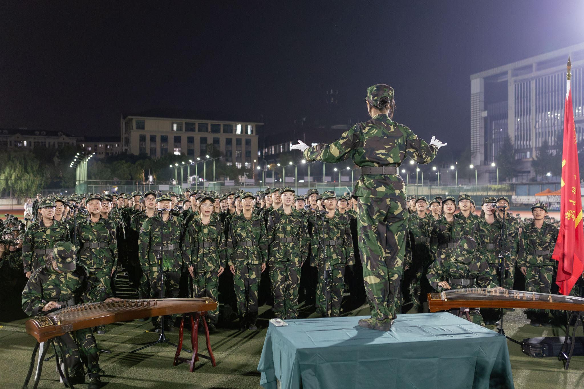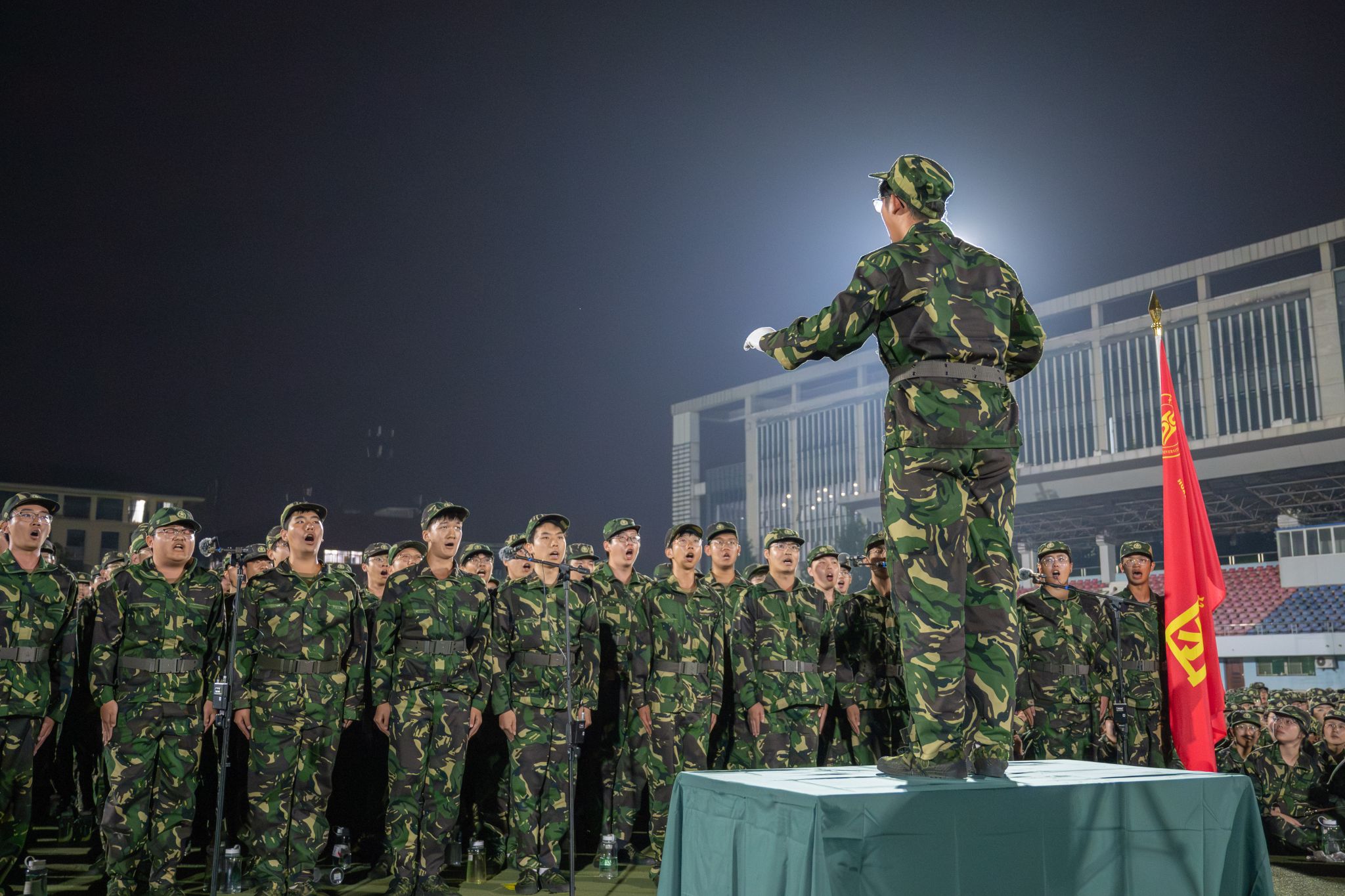 管乐声落,掌声未歇,拉歌对战的热情再度升温。红队四团以一首《歌唱祖国》震撼登场。“五星红旗迎风飘扬,胜利歌声多么响亮” 的旋律响彻夜空,同学们眼神坚定、歌声豪迈,将对祖国山河的热爱、对民族复兴的期盼融入每一句深情演唱,仿佛让人看见从抗战烽火中崛起的中华,正昂首阔步走向繁荣富强。蓝队二团一首《中国空军进行曲》,以激昂的曲调描绘战鹰呼啸、划破长空的场景,完美诠释了空天卫士的凌云壮志。同学们身姿挺拔,演唱铿锵有力,既展现了中国空军捍卫领空的坚定决心,也让 “强军有我” 的信念在每一位学子心中深深扎根。