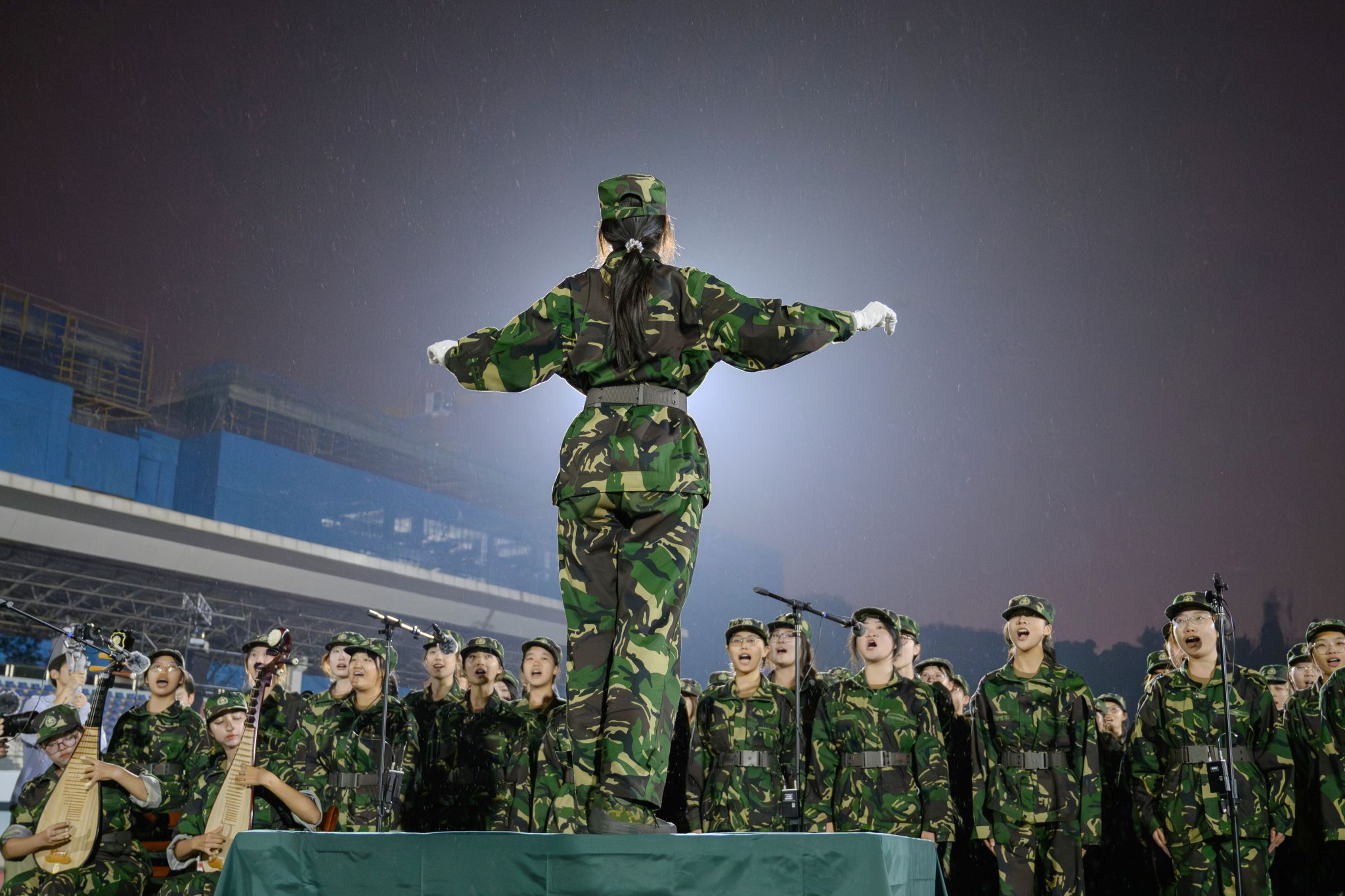 红队十四团的《女兵谣》为现场带来别样风采,女生们的演唱既有军人的飒爽,又不失青春的灵动,将女兵们在军营中坚守岗位、勇担使命的形象生动呈现,唱出了强军路上巾帼力量的独特魅力,柔和却坚定的歌声直抵人心。蓝队八团紧接着唱响《祖国不会忘记》,“在茫茫的人海里,我是哪一个;在奔腾的浪花里,我是哪一朵”,朴实的歌词搭配深情的演唱,道出了无数默默奉献者的心声。同学们神情庄重,用歌声致敬那些为国家发展、民族复兴付出的平凡英雄,也表达了自己愿以青春之力投身强国事业的决心。