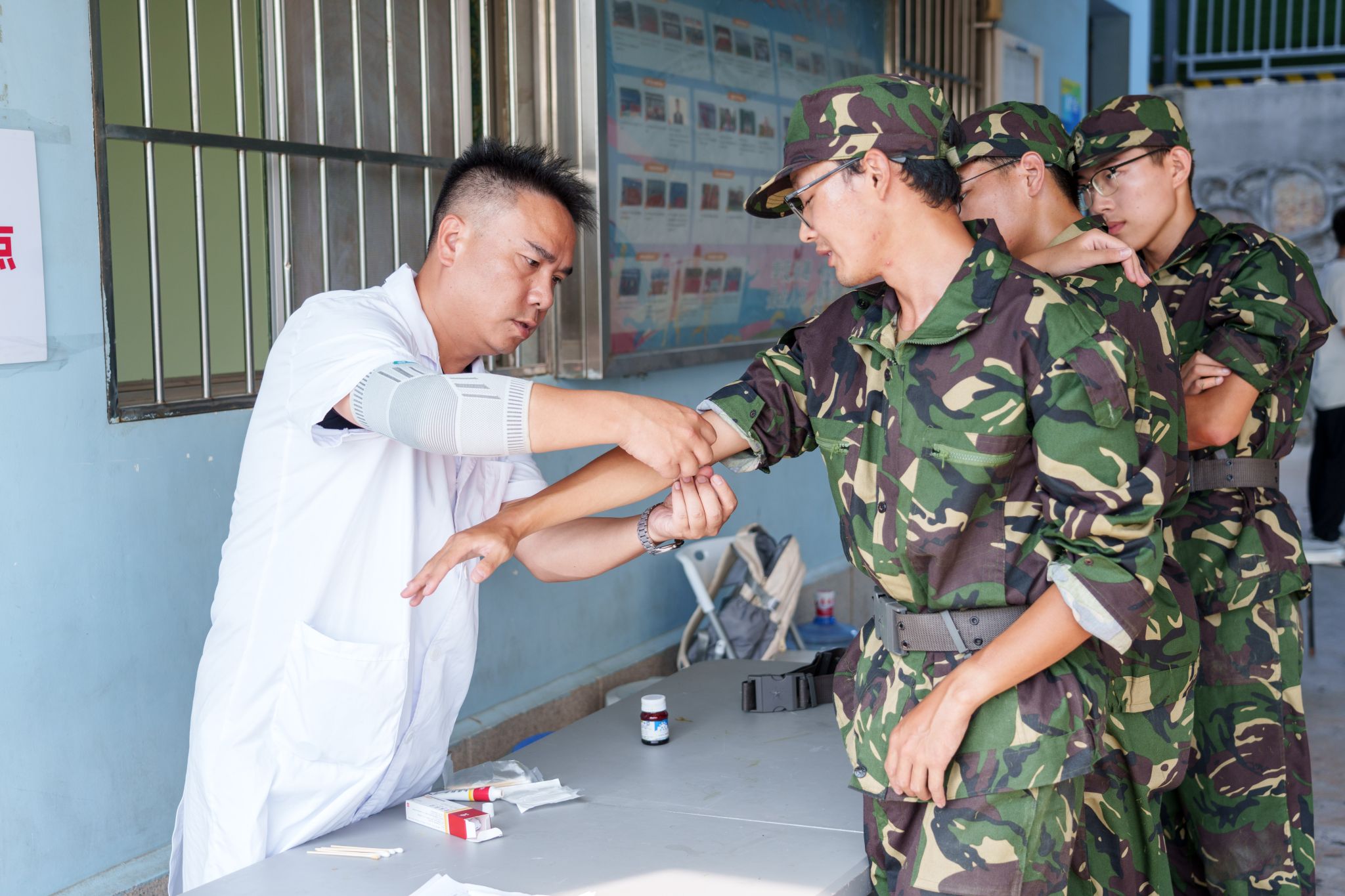训练场边,学生党员志愿者与文明值勤队队员穿梭不息,成为军训学员们贴心的“后勤兵”。医疗点上,校医院的医护人员全天值守,处理扭伤、中暑等突发状况,默默守护军训学员的健康。军训场周边,校园建设与安全保卫部保卫人员加强交通巡逻,及时疏导车辆、设置安全警示,确保训练区域道路畅通,让军训学员专注训练、安全无虞。体育部全力协调训练场地,保障各科目训练有序轮转。食堂精心准备营养餐食,保证学员“训后有热饭,能量有补充”。