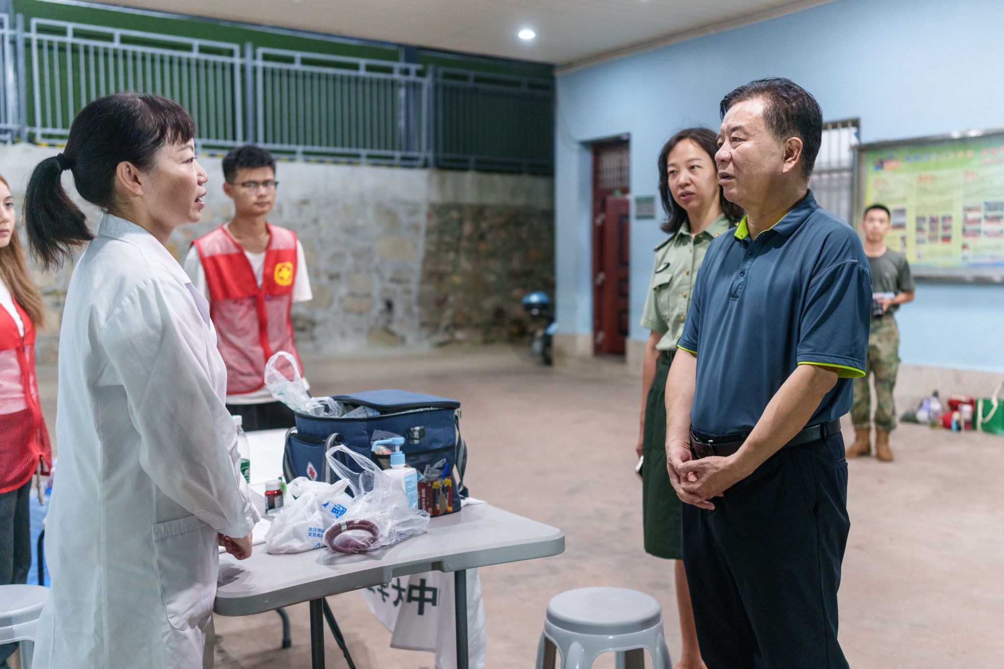 ▲校党委书记姚江林在军训场医疗点看望慰问医护人员和志愿者(学通社记者 韩鑫垚 摄)